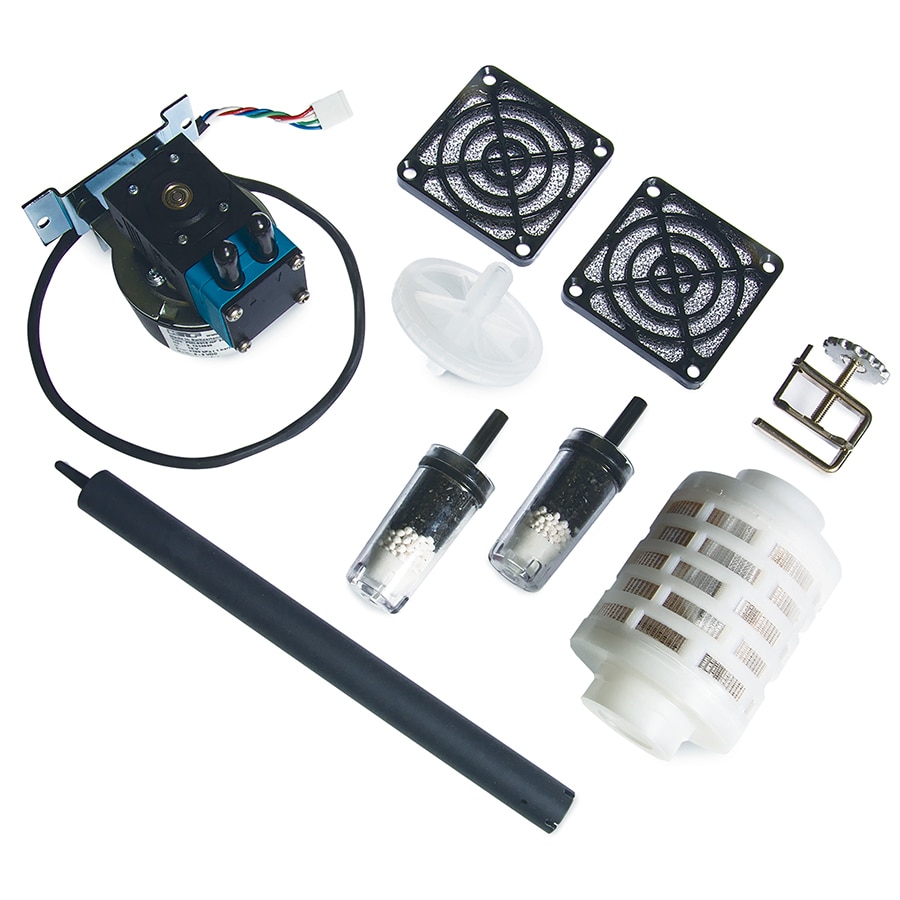 deionizer cartridge; 100 µm water filter; environmental filters (2); filter replacement tool; tube clamp; water pump; and fan guard (2) |