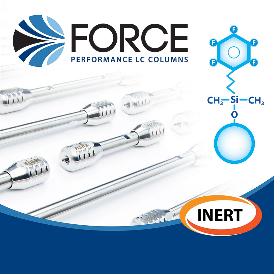 Our new inert LC column technology helps labs improve their analysis of metal-sensitive compounds. A premium inert coating applied to the stainless-steel surface of our LC columns reduces nonspecific binding of chelating analytes, enabling sensitive analysis and smooth integration of peaks. The culmination of 20+ years in LC, Force performance LC columns are long-lasting and reproducible, even under the stress of UHPLC. Premium quality is backed by the strength of our 100% Pure Satisfaction guarantee. And perhaps most important, Force columns are fully scalable between 3 or 5 µm HPLC and 1.8 µm UHPLC, so you can easily transfer and optimize methods without extensive calculations. Apply Force LC columns to all of your HPLC and UHPLC instrument platforms. Restek's FluoroPhenyl phase offers chromatographers the ability to run in reversed-phase or HILIC mode for a variety of compounds. Restek's FluoroPhenyl columns are also amenable to LC-MS because they are extremely reliable and efficient with acidic mobile phases. Stationary Phase Category: Pentafluorophenyl propyl (L43) Recommended Usage: * For maximum lifetime, recommended maximum pressure for 1.8 μm particles is 830 bar/12,000 psi. Properties:
