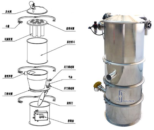 我公司生产的真空加料机是在广泛吸收国外同类产品的基础上开发研制的新产品,目前它是国内最为先进、理想、完善的粉状料、粒状料、粉粒料混合料的真空输送设备。真空加料机能自动地将各种物料输送到包装机、注塑机、粉碎机等设备的料斗中,也能直接把混合的物料输送到混合机(如V型混合机、二维混合机、三维混合机等)中,减轻了工人劳动强度,解决了加料时粉尘外溢等问题,是制药厂、食品厂通过GMP认证、促进清洁、文明生产的首选设备。 真空加料机由真空泵(无油、无水)、不锈钢吸料咀、输送软管、PE过滤器(或316L不锈钢过滤器)、压缩空气反吹装置、气动放料门装置、真空料斗和料位自动控制装置等组成,整套系统设计合理、制造精美。 真空加料机分间隙排料和连续排料两种,间隙排料有利于降低设备的投资成本,方便料位控制,在多数情况下,我们建议用户采用间隙排料式。连续排料一般用在长距离、大产量时对物料的真空输送。 技术参数