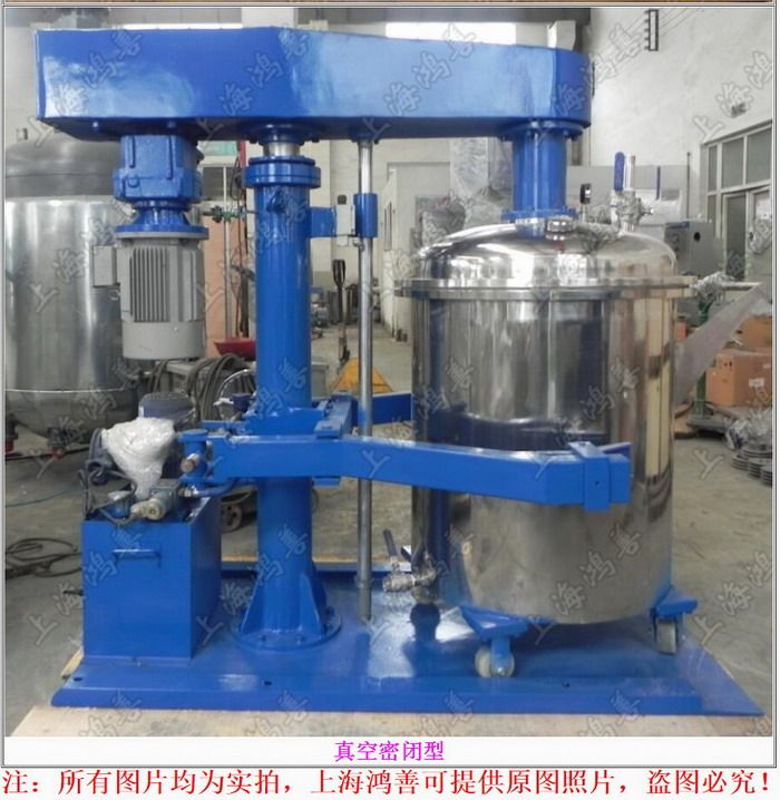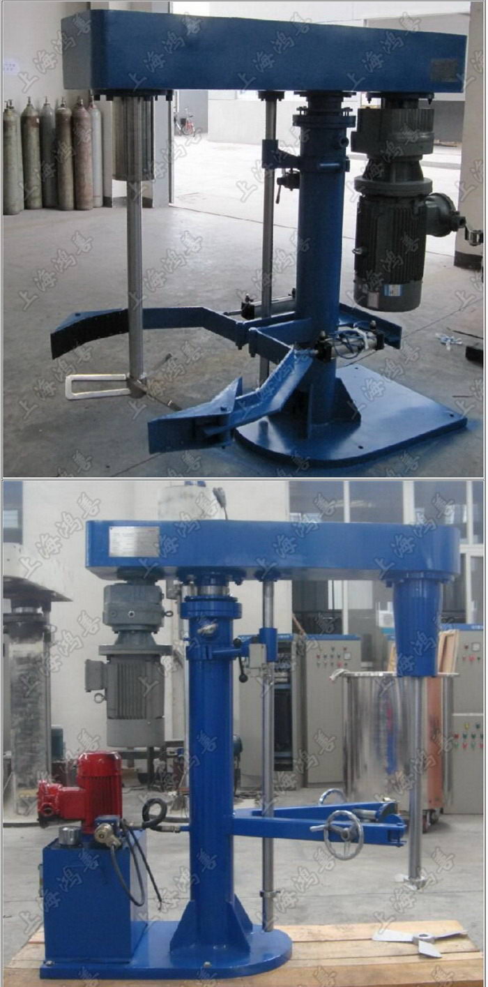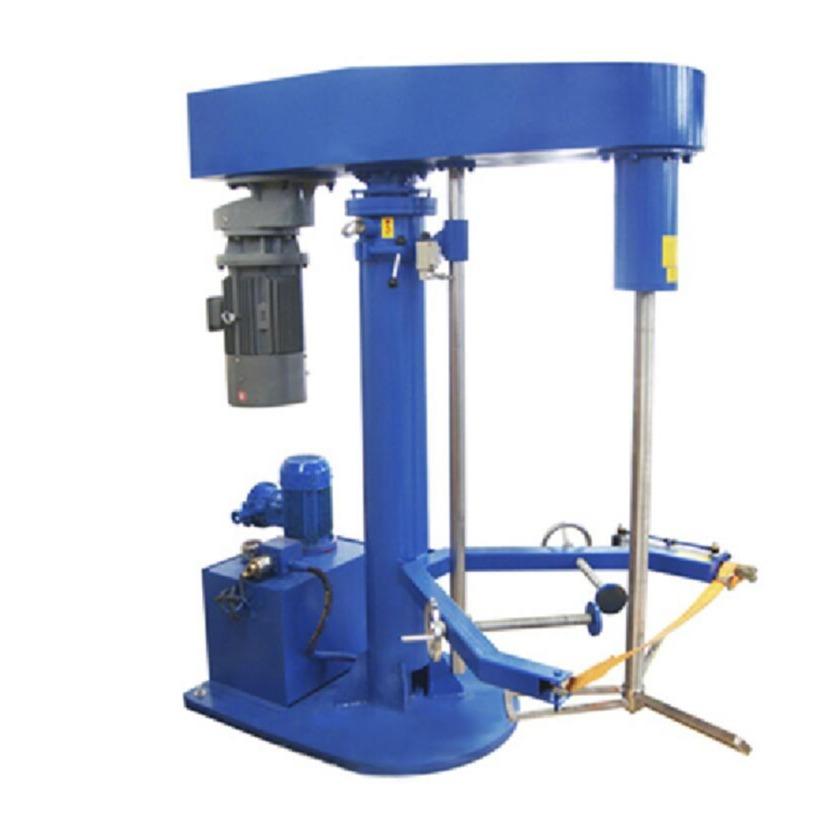 本设备的搅拌桨叶在动力机组的驱动下,沿固定方向旋转;在旋转过程中,驱使物料做轴向旋转和径向旋转。搅拌机内的物料,同时存在轴向运动和圆周运动,因而同时存在剪切搅拌和扩散搅拌等几种搅拌形式。能够有效的对物料进行分散、搅拌。通过控制油泵工作带动液压机架升降,液压机架带动整个传动机构和工作组升降。