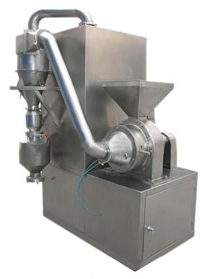 主要用途 该机适用于制药、食品、化工等行业,具有风冷、无筛网等多种性能,它不受物料粘度、软硬及纤维等限制,对任何物料起到较好的效果。特别适用于粉碎带纤维的中药材,带一定油脂性的物料。 工作原理 该机由加料斗、分级轮、粉碎刀片、齿圈、粉碎电机、出料口、集料箱、吸尘箱等部分组成,物料由加料斗进入粉碎室,通过高速旋转的刀片进行粉碎,调节分级轮与分级盘德距离来达到要求的物料细度,达到要求的料从粉碎室引到集料箱布袋中,没有达到要求的料继续在粉碎室中粉碎。集料箱布袋产生的粉尘由吸尘箱收集。该机组按“GMP”标准设计,结构简单、操作小、产量高,机器采用优质不锈钢材料制造,粉碎过程中无尘飞扬。 技术参数