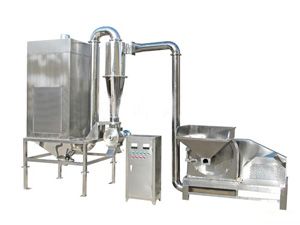 主要功能 该机组适用于制药、食品、化工等其他行业。具有风冷,无筛网等多种性能,特别适合于粉碎纤维状和带一定油脂的物料。 工作原理 该机由粉碎主机、旋风分离器、脉冲除尘箱等部分组成。物料由加料进入粉碎室,通过高速旋转的锤片进行粉碎,粉碎细度可调节分级刀与分级盘德距离来达到所需要的细度,粉碎好的物料经旋转离心力和引风机的作用进入旋风分离器,然后,通过关风机出料,粉尘进入脉冲除尘箱,经过过滤筒过滤后回收利用。该机按“GMP”标准设计,整机全部用不锈钢材料制造,粉碎过程中无粉尘飞扬。 技术参数
