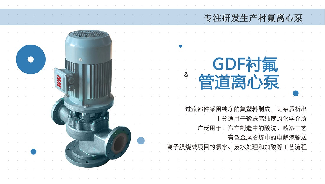 按国际标准设计,过流部件全部紧衬氟塑料,泵的承重部分为金属材料。立式设计占地面积小,进出口都在一条水平线上,可用于有限空间或者直线管路的增压。用途:汽车制造中的酸洗、喷漆工艺;有色金属冶炼中的电解液输送;离子膜烧碱项目中的氯水、废水处理和加酸工艺流程。流量范围:12.5T/h-100T/h,扬程范围:20m-60m,功率范围:2.2kw-18.5kw,运行温度:-20℃—120℃。可根据实际工况要求变更配置。