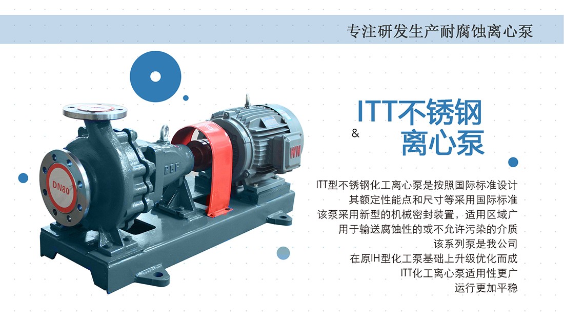 ITT型不锈钢化工离心泵是按照国际标准设计,其额定性能点和尺寸等采用国际标准,用于输送腐蚀性的或不允许污染的介质,该系列泵是我公司在原IH型化工泵基础上升级优化而成,ITT化工离心泵适用性更广,运行更加平稳。用途:适用于化工、石油、冶金、电力、造纸、食品、制药、环保、废水处理和合成纤维等行业用于输送各种腐蚀的或不允许污染的类似于水的介质。流量范围:12.5T/h-100T/h,扬程范围:20m-60m,功率范围:2.2kw-18.5kw,运行温度:-20℃—150℃。可根据实际工况要求变更配置。