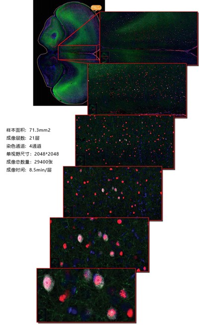TissueFAXS Q+ 高分辨全景快速扫描系列,可以实现在组织学水平获得样本大批量高分辨全景图像,系统主要从全景成像角度,实现不同规格样本整体组织原位单细胞、特定组织功能区域、特定结构、空间相互作用位置的关系等整体大数据数据结果深度分析。 该系统主要以组织化学染色技术,结合高分辨全景扫描无缝拼接成像为基础,良好的解决了传统设备通常用于单视野内特定细胞亚结果或蛋白的成像弊端,无法提供整张玻片上细胞或特定结构的全景空间位置信息的问题。 小鼠脑全脑共聚焦成像(20x物镜) |