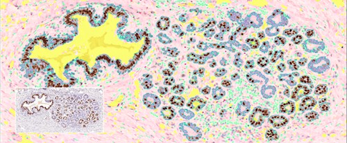 特异性组织区域识别解决方案,适用于明场/荧光样本。对于彩色明场样本,可自动独立细胞核/质/膜染色通道: 1. 利用苏木素/DAPI染色通道,对细胞核进行精确识别,继而定量细胞核/质/膜信号强度分布及面积形态; 2. 利用特异性染色及组织特征,识别上皮细胞/间质区域/空腔等结构,对肿瘤/腺体/胶原增生等组织类型进行识别及定量分析。 该解决方案还可用于HE染色样本的细胞-组织结构识别,使大量样本快速染色+深度分析的工作模式成为可能。 正反向回溯数据验证