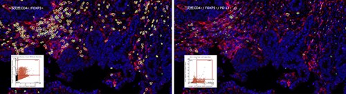 组织流式定量分析技术赋予每个细胞多个分析参数,配合Gate和Input Gate功能,可供使用者筛选特定的感兴趣细胞亚群。利用 Gate 工具根据细胞核大小、染色强度差异能够准确筛选出有消息报,并且排除粘连细胞和细胞碎片(左侧散点图)。新建散点图仅分析有效细胞(右侧散点图),利用 Gate 可进一步将有效细胞划分成不同 marker 表达强度群体,简单实现marker 表达强度准确统计。 细胞表型原位共表达分析