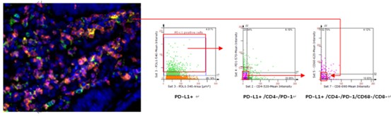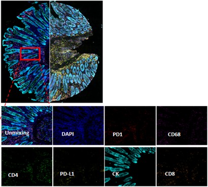 结肠癌是常见的发生于结肠部位的消化道恶性肿瘤之一,癌变诱发性炎症反应导致在癌变相关区域出现免疫细胞浸润。众多研究表明不同类型的细胞及因子,在肿瘤免疫反应中起到的作用和对肿瘤患者的影响结果均有不同,例如CD4/CD8淋巴细胞是结肠癌患者预后情况的主要指标,随着对PD1/PD-L1研究的深入其也在一定程度上可以作为免疫检查点疗法的判断指证。 生物体原位多表型细胞的量化分析方案
