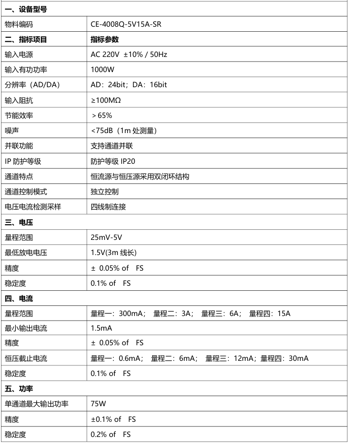 CE-4008Q-5V15A-SR是一款专为电池研发、生产及质检设计的智能化测试设备,支持多类型电池(铅酸、锂离子、镍氢等)的浮充测试、循环寿命测试及充放电性能验证。可满足工业级电池测试的严苛需求,是新能源、储能系统、通信基站等领域的理想选择。 功能特点: 电压分辨率:25mV~5V量程,精度±0.05% FS,稳定度0.1% FS,确保浮充电压稳定性检测。 电流控制:四档量程(300mA/1A/6A/15A),最小输出电流1.5mA,恒压截止电流至0.2mA~30mA,满足微小电流场景需求。 四线制采样:消除线阻干扰,提升电压电流检测准确性。 高效节能与安全 节能效率>65%:降低长期测试能耗成本。 双闭环控制:恒流源与恒压源独立闭环结构,防止过充/过放,保障测试安全。 IP20防护:基础防尘设计,适配实验室及产线环境。 灵活扩展与智能化 通道并联功能:支持多通道并联,轻松扩展测试容量。 独立控制模式:每个通道可单独设置参数,适应多规格电池同步测试。 低噪声运行:<75dB(1米处),确保安静工作环境。 工业级可靠性 宽电压输入:AC 220V ±10%,兼容不稳定电网环境。 高输入阻抗≥100MΩ:减少对被测电池的影响,保护电池性能。