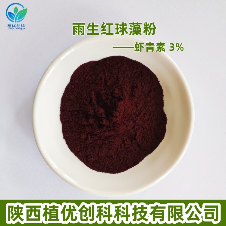 产品名称:雨生红球藻粉 虾青素 雨生红球藻提取物 虾青素微囊粉 英文名称:Haematococcus pluvialis powder 拉丁名称:Haematococcus pluvialis 提取来源:淡水单细胞绿藻——雨生红球藻 产品编号:ZY-020 有效成分:虾青素 产品纯度:2%、2.5%、3%、5%、10% 产品外观:红棕色粉末 检测方法:HPLC CAS No.: 472-61-7 分子式: C₄₀H₅₂O₄ 分子量:596.85 适用行业:可用于保健食品、化妆品、功能性食品以及水产养殖与饲料行业 包装规格:1kg/铝箔袋,25kg/纸板桶 储存条件:密封、避光、阴凉干燥处保存。 保质期:24个月(未开封,符合储存条件下)