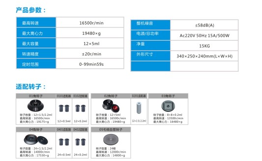 应用领域: ●广泛应用于医学检验,生命科学,生物工程,生物化学、医学研究、农牧业、生物制药等领域。 产品特性: ●钢制机身,大力矩无刷电机驱动:无碳粉污染,噪音低、震动小、转速控制精度高。 ●彩屏界面显示:转速,离心力,运行时间,转子号,升降速率等。按键控制。 ●内置10种升/降速率档位,升降速率最快可达15S,用户可根据实验需求自行选择档位,确保离心效果佳,带瞬10:00时离心功能, ●巧妙的降温风道设计技术,有效控制离心过程中腔内的温度升高。 ●多级阻尼减震设计:震动小,离心效果佳. ●具有门盖、误操作等诊断功能,机器可直接显示故障信息,便于判断和维修,确保人机安全。