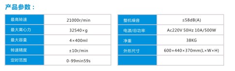 应用领域: ●适用于分子生物、蛋白质、DNA、RNA、血液成分分离和细胞组份分离等,广泛应用于临床医学,生命科学,生物工程,生物化学、医学研究、农牧业、生物制药等领域。 产品特性: ●钢制机身,大力矩无刷交流变频电机驱动:无碳粉污染,噪音低、震动小、转速控制精度高。 ●大彩屏界面显示,触摸控制,操作简便。 ●内置10种升/降速率档位,可根据实验需求自定义档位,确保离心效果佳。 ●巧妙的降温风道设计技术,有效控制离心过程中腔内的温度升高。 ●既能高速离心(21000r/min),又能低速水平离心(4x400ml),一机多功能。 ●具有门盖、误操作等诊断功能,机器可直接显示故障信息,便于判断和维修,确保人机安全。