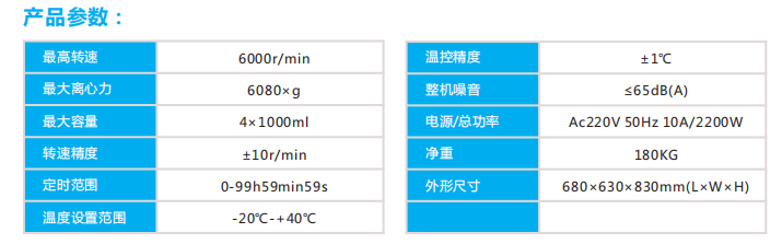 应用领域: 适用于血液成分分离,核酸提取、细胞组份分离等,广泛应用于临床检验,生命科学,生物工程,生物化学、医学研究、农牧业、生物制药等领域。 产品特性: 钢制机身,大力矩无刷交流变频电机驱动:无碳粉污染,噪音低、震动小、转速控制精度高。 可程式7寸彩色触摸屏显示:转速,离心力,运行时间,转子号及明细,升降速率等;带触摸屏锁定功能,防止误操作。 内置10种升/降速率档位,可根据实验需求自定义档位,确保离心效果佳。 采用进口高效环保制冷系统,智能化预冷,制冷速度快,噪音低,温控精度高,可选配加热模块。 多级阻尼减震设计:震动小,离心效果佳。 具有门盖、误操作等诊断功能,机器可直接显示故障信息,便于判断和维修,确保人机安全。