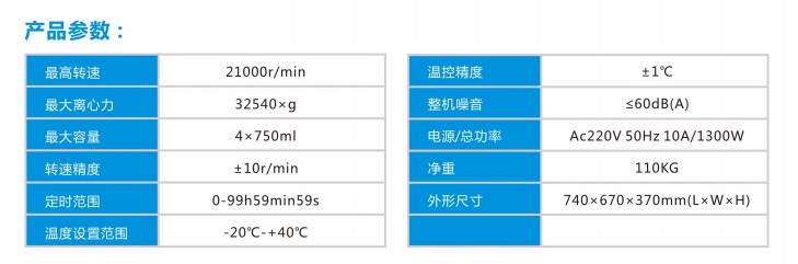 应用领域: ●适用于分子生物、蛋白质、DNA、RNA、血液成分分离和细胞组份分离等,广泛应用于临床医学,生命科学,生物工程,生物化学、医学研究、农牧业、生物制药等领域。 产品特性: ●钢制机身,大力矩无刷交流变频电机驱动:无碳粉污染,噪音低、震动小、转速控制精度高。 ●可程式彩色触摸屏和8按键双操作系统供用户自由选择使用。界面可显示:转速,离心力,运行时间,转子号及明细,升降速率等;带触摸屏锁定功能,防止误操作. ●内置10种升/降速率档位,可根据实验需求自定义档位,确保离心效果佳。 ●采用进口高效环保制冷系统,智能化预冷,制冷速度快,噪音低,温控精度高,可选配加热模块。 ●既能高速离心(21000r/min),又能大容量离心(4x750ml),一机多功能。 ●具有门盖、误操作等诊断功能,机器可直接显示故障信息,便于判断和维修,确保人机安全