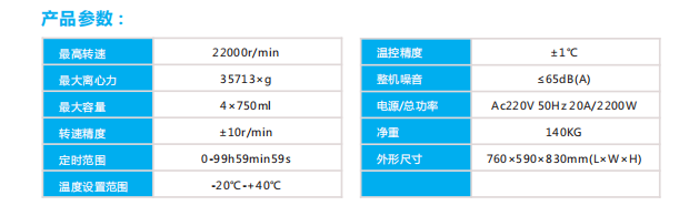 应用领域: 适用于分子生物、蛋白质、DNA、RNA、血液成分分离和细胞组份分离等,广泛应用于临床医学,生命科学,生物工程,生物化学、医学研究、农牧业、生物制药等领域。 产品特性: 钢制机身,大力矩无刷交流变频电机驱动:无碳粉污染,噪音低、震动小、转速控制精度高。 可程式7寸彩色触摸屏显示:转速,离心力,运行时间,转子号及明细,升降速率等;带触摸屏锁定功能,防止误操作。 内置10种升/降速率档位,可根据实验需求自定义档位,确保离心效果佳。采用进口高效环保制冷系统,智能化预冷,制冷速度快,噪音低,温控精度高,可选配加热模块。 既能高速离心(22000r/min),又能大容量离心(4×750ml),一机多功能。 具有门盖、误操作等诊断功能,机器可直接显示故障信息,便于判断和维修,确保人机安全。