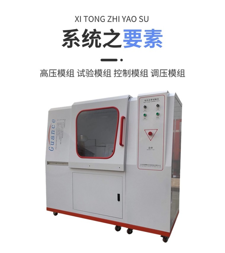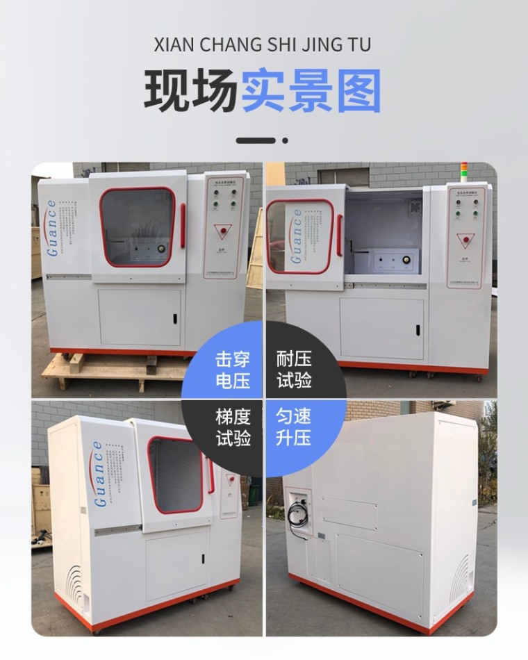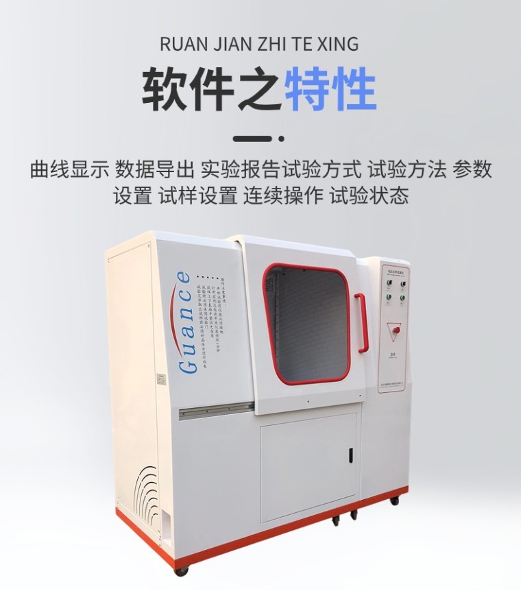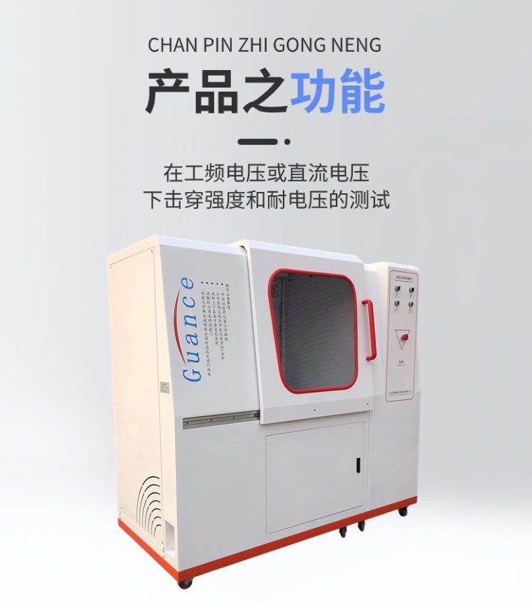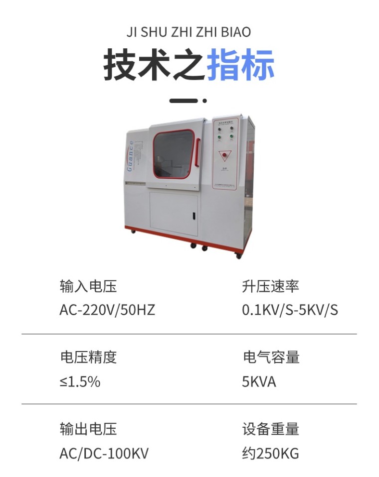 电压击穿试验仪-微机控制 GCDDJ-100Kv 一、适用范围及功能主要适用于固体绝缘材料(如:塑料、橡胶、层压材料、薄膜、树脂、云母、陶瓷、玻璃、绝缘漆等绝缘材料及绝缘件)在工频电压或直流电压下击穿强度和耐电压的测试。 二、系统组成: 控制模组:本仪器由电脑上位机软件控制,是我公司自主研发的全新第三代介电强度检测仪器,本仪器核心控制系统是通过西门子PLC控制,数据采集部分由西门子数字量集成模块完成,和电脑通讯数据采集由光电隔离线完成,有效解决试验过程中的抗干扰问题,电压采集和电流采集由高精度传感器完成。 调压模组:本模组主要应用于调压,可以对升压速率进行调节,有高压归零限位及高压升压限位。主要硬件组成有调压器、电机等部件组成。软件操作使用方便,能够实时显示升压曲线、泄露电流动态曲线,同时升压速率无级可调,可以根据自己的需要进行升压速率调节,使升压速率真正做到匀速、准确,击穿后自动判停,自动记录测试结果,显示试验数据,判断准确,并可保存,分析,打印试验数据。 高压模组:本模组主要是通过高压发生器,使电压从低压按照设定的升压速率进行升压,核心部件主要由变压器及配套的抗干扰配件组成。 试验模组:本部分主要有配套的试验电极、试验油槽、试验支架组成,可根据用户需要,在高温试验环境中进行。 二、软件功能: 01、软件平台:WINDOWS窗口操作平台,界面直观,便于操作 02、曲线显示:在实验过程中可以动态显示试验曲线 03、数据导出:可以对试验结果导入EXCEL表格 04、实验报告:可以人为设置报告名称,并对实验报告进行打印 05、试验方式:可以根据需求对直流试验和交流试验进行灵活选择 06、试验方法:可以根据需求自行选择击穿电压、耐压试验、梯度试验 07、参数设置:可以根据不同的试验方式及试验方法灵活设置所需的不同参数值 08、试样设置:可对不同标准的试样参数灵活设置 09、连续操作:连续操作试验时,可直接在软件里结束试验,进行二次试验 10、试验状态:软件里实时显示当前试验状态,如:试验门是否关闭,升压指示、归零复位指示等 三、技术要求: 01电气容量5KVA 02输出电压AC/DC-100KV 03输入电压AC-220V/50HZ 04升压速率0.1KV/S-5KV/S可手动设置 05升压方式匀速升压/梯度升压/耐压试验 06击穿判停电压判停/电流判停 07试验介质空气中试验/油浴中试验/高温试验高温为选配 08数据采集光电隔离线,抗干扰性强 09电压精度≤1.5% 10泄露电流0-100mA传感器量程 11电压传感器0-100V传感器量程 12电极规格片材电极:φ25mm-2个,φ75mm-1个可根据要求定制电极 13试验放电电动自动放电 14 电极升降手动放置/自动升降自动升降为选配 15试验油槽长宽高-300mm*150mm*200mm槽内有悬空架,方便更换试样 16试验照明内置照明灯 17试验排风内置排风扇 18试验指示主机集成试验多色塔灯,指示试验状态 19试验门气动杆试验门/滑动门滑动门为自动升降电极专用 20**防护超压保护/过流保护/短路保护/漏电保护 21工作环境室温,湿度≤65% 22主机尺寸长宽高-1500mm*850mm*1700mm 23试验空间尺寸长宽高-750mm*600mm*800mm 24试验门观察窗玻璃门尺寸-长宽550mm*600mm大视窗便于观察 25设备重量约250KG |