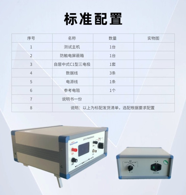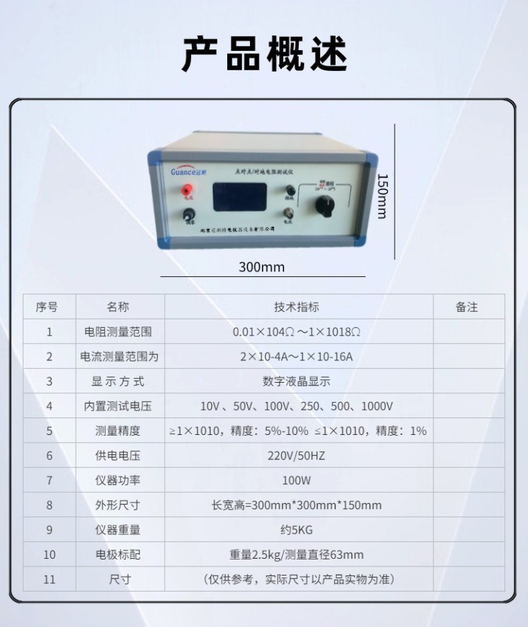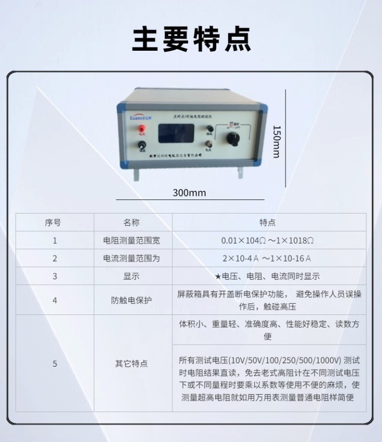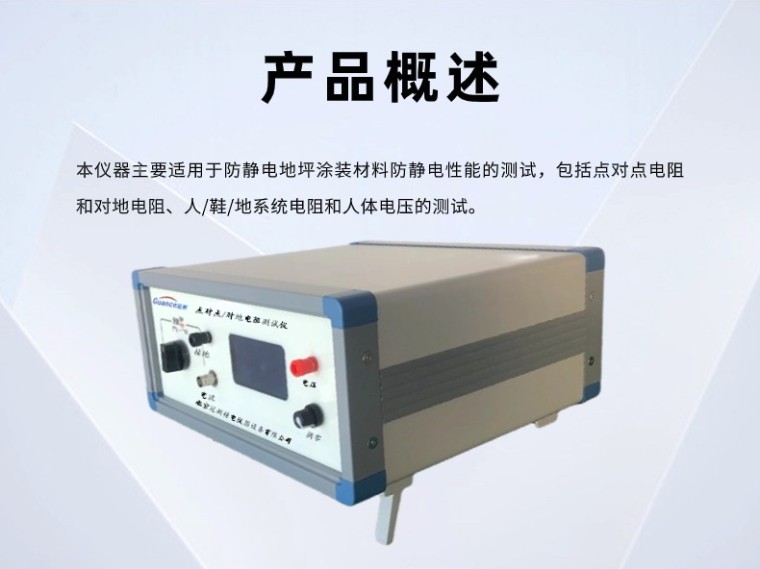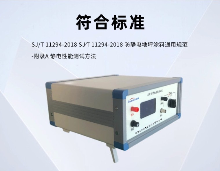 (防静电地坪涂装材料专用) 点对点/对地电阻测试仪 GCGEST-121C 符合标准: SJ/T 11294-2018 SJ∕T 11294-2018 防静电地坪涂料通用规范 -附录A 静电性能测试方法 一、产品概述 本仪器主要适用于防静电地坪涂装材料防静电性能的测试,包括点对点电阻和对地电阻、人/鞋/地系统电阻和人体电压的测试。 二、技术指标: 序号 名称 技术指标 备注 1 电阻测量范围 0.01×104Ω ~1×1018Ω 2 电流测量范围为 2×10-4A~1×10-16A 3 显 示 方 式 数字液晶显示 4 内置测试电压 10V 、50V、100V、250、500、1000V 5 测量精度 ≥1×1010,精度:5%-10% ≤1×1010,精度:1% 6 供电电压 220V/50HZ 7 仪器功率 100W 8 外形尺寸 长宽高=300mm*300mm*150mm 9 仪器重量 约5KG 10 电极标配 重量2.5kg/测量直径63mm 五、主要特点 序号 名称 特点 1 电阻测量范围宽 0.01×104Ω ~1×1018Ω 2 电流测量范围为 2×10-4A ~1×10-16A 3 显示 ★电压、电阻、电流同时显示 4 防触电保护 屏蔽箱具有开盖断电保护功能, 避免操作人员误操作后,触碰高压 5 其它特点 体积小、重量轻、准确度高、性能好稳定、读数方便 所有测试电压(10V/50V/100/250/500/1000V) 测试时电阻结果直读,免去老式高阻计在不同测试电压下或不同量程时要乘以系数等使用不便的麻烦,使测量超高电阻就如用万用表测量普通电阻样简便 根据欧姆定律,被测电阻Rx等于施加电压V除以通过的电流I。传统的高阻计的工作原理是测量电压V固定,通过测量流过取样电阻的电流I来得到电阻值。 从欧姆定律可以看出,由于电流I是与电阻成反比,而不是成正比,所以电阻的显示值是非线性的,即电阻无穷大时,电流为零,即表头的零位处是∞,其附近的刻度非常密,分辨率很低。整个刻度是非线性的。 又由于测量不同的电阻时,其电压V也会有些变化,所以普通的高阻计是精度差、分辨率低。 本仪器是同时测出电阻两端的电压V和流过电阻的电流I,通过内部的大规模集成电路完成电压除以电流的计算,然后把所得到的结果经过A/D转换后以数字显示出电阻值,即便是电阻两端的电压V和流过电阻的电流I是同时变化, 其显示的电阻值不象普通高阻计那样因被测电压V的变化或电流I的变化而变,所以,即使测量电压、被测量电阻、电源电压等发生变化对其结果影响不大,其测量精度很高;从理论上讲其误差可以做到零,而实际误差可以做到千分之几或万分之几。 |
