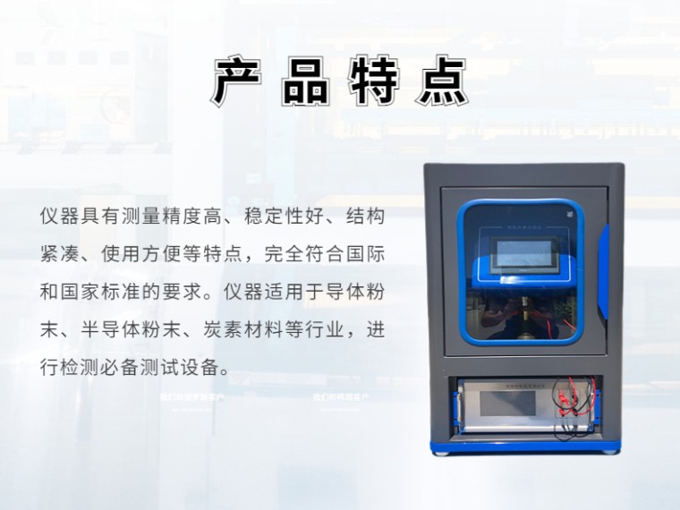 粉末电阻率测试仪 产品名称:粉末电阻率试验仪 产品型号:GEST-126 参考标准:YS T 587.6-2006 炭阳极用煅后石油焦检测方法第6 部分:粉末电阻率的测定.pdf GB/T 24525-2009 炭素材料电阻率测定方法 GBT 24521-2009 焦炭电阻率测定方法 GB/T 3782-2016 乙炔炭黑-电阻率测试仪 产品概述: 粉末电阻率试验仪主要用于测量粉末材料电阻率试验的专用仪器. 由于粉末材料的密实度不同,在松装和振实密度条件下,所测试得到的数据是不同的,所以测试粉末电 阻,要求在规定的压力条件下进行测试.便于进行有效数据的测试及对比. 仪器由主机、测试架两大部分组成。主机包括高灵敏的直流数字电压表和高稳定的直流恒流源测量 试验设置通过触摸屏进行操作和设置,页面布局合理,人性化设计,可对测试结果进行打印。 仪器具有测量精度高、稳定性好、结构紧凑、使用方便等特点,完全符合国际和国家标准的要求。 仪器适用于导体粉末、半导体粉末、炭素材料等行业,进行检测必备测试设备。 仪器主要技术指标: 一、测量范围: 测量半导电电阻率时: 电阻率10-6—105Ω-cm;分辩率10-8Ω-cm 测量其他(电线电缆)电阻时: 电阻10-4--2X105Ω,分辨率0.01uΩ |