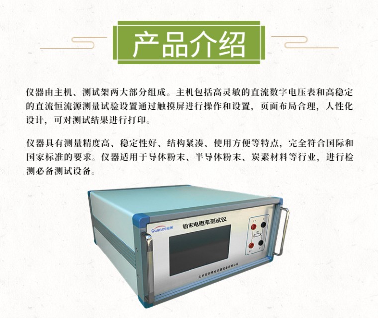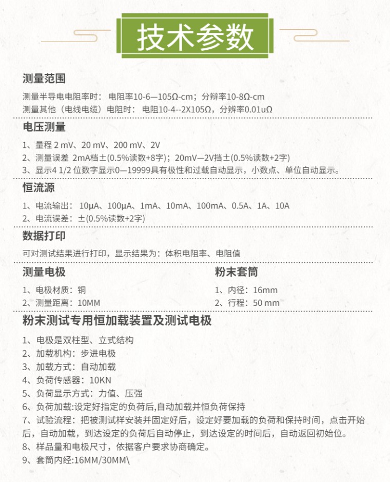 产品名称:粉末电阻率试验仪 产品型号:FTDZ-I 产品概述: 粉末电阻率试验仪主要用于测量粉末材料电阻率试验的专用仪器. 由于粉末材料的密实度不同,在松装和振实密度条件下,所测试得到的数据是不同的,所以测试粉末电 阻,要求在规定的压力条件下进行测试.便于进行有效数据的测试及对比. 仪器由主机、测试架两大部分组成。主机包括高灵敏的直流数字电压表和高稳定的直流恒流源测量 试验设置通过触摸屏进行操作和设置,页面布局合理,人性化设计,可对测试结果进行打印。 仪器具有测量精度高、稳定性好、结构紧凑、使用方便等特点,完全符合国际和国家标准的要求。 仪器适用于导体粉末、半导体粉末、炭素材料等行业,进行检测必备测试设备。 仪器主要技术指标: 一、测量范围: 测量半导电电阻率时: 电阻率10-6—105Ω-cm;分辩率10-8Ω-cm 测量其他(电线电缆)电阻时: 电阻10-4--2X105Ω,分辨率0.01uΩ 二、 电压测量: 1. 量程 2 mV、20 mV、200 mV、2V 2. 测量误差 2mA档±(0.5%读数+8字);20mV—2V挡±(0.5%读数+2字) 3. 显示4 1/2 位数字显示0—19999具有极性和过载自动显示,小数点、单位自动显示。 三、 恒流源: 1. 电流输出: 10μA、100μA、1mA、10mA、100mA、0.5A、1A、10A 2. 电流误差:±(0.5%读数+2字) |