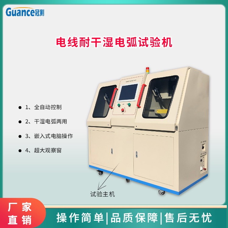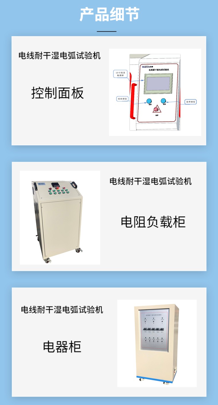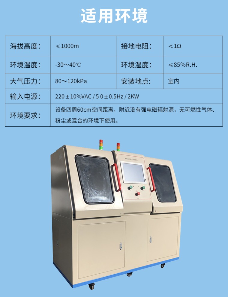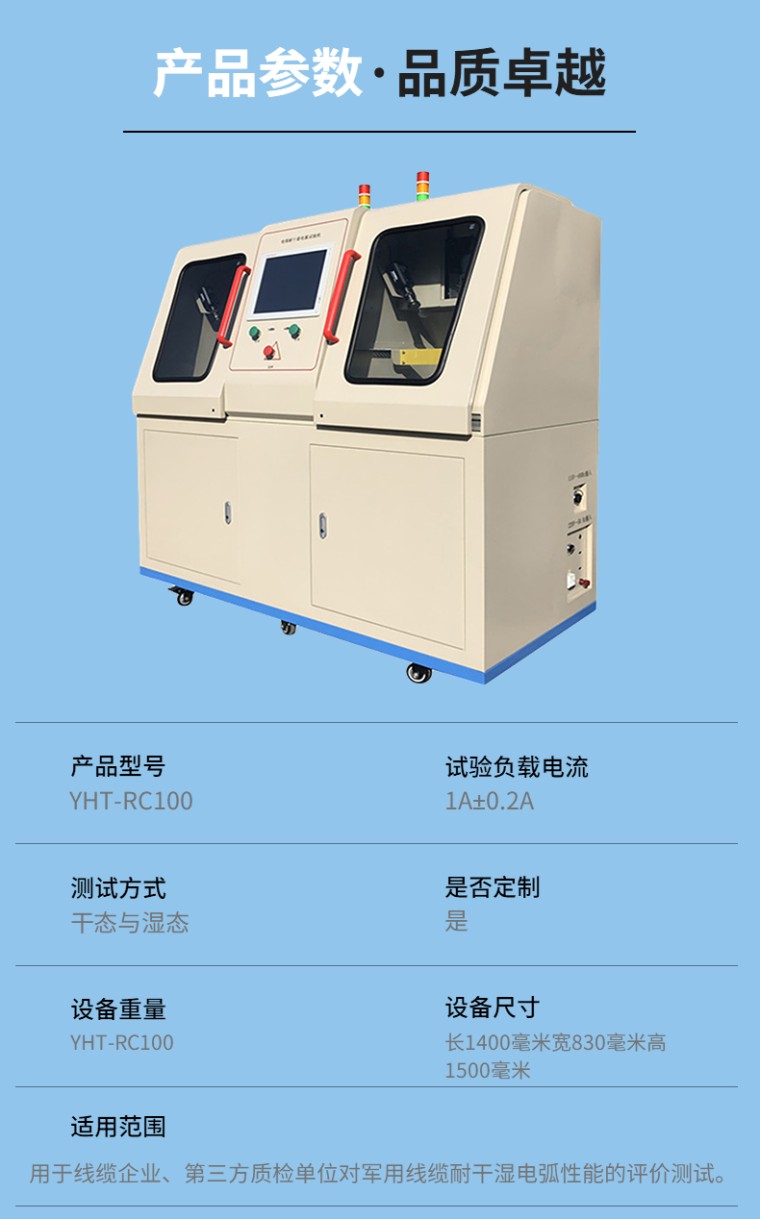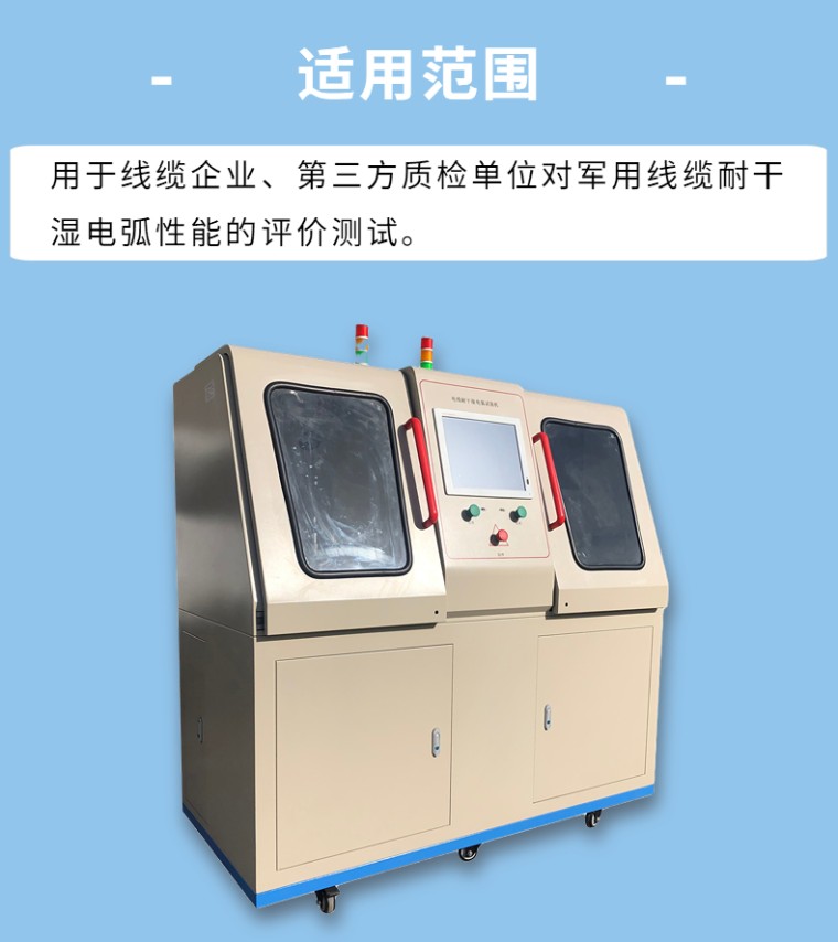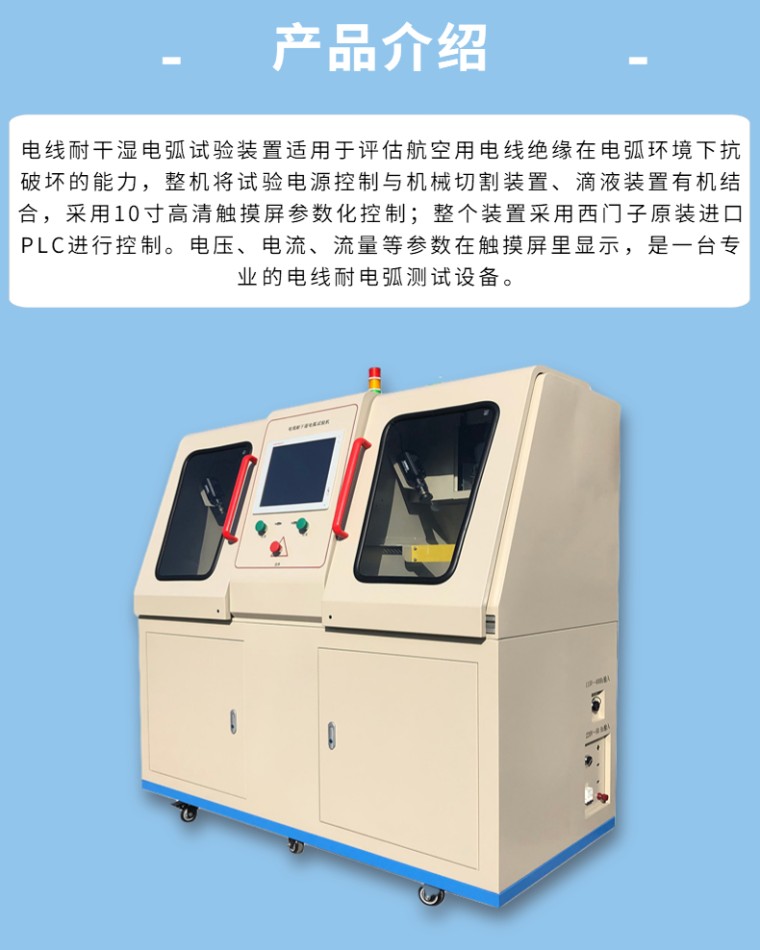 电线耐干湿电弧试验机 YHT-RC100 一、主要适用范围及功能 电线耐干湿电弧试验装置适用于评估航空用电线绝缘在电弧环境下抗破坏的能力,整机将试验电源控制与机械切割装置、滴液装置有机结合,采用10寸高清触摸屏参数化控制;整个装置采用西门子原装进口 PLC进行控制。电压、电流、流量等参数在触摸屏里显示,是一台专业的电线耐电弧测试设备。 二、符合标准: : 满足 AS4373D、GJB773、ASD-STAN、PrEN6059-502标准 三、使用环境 1、海拔高度:≤1000m 2、环境温度:-30~40℃; 3、环境湿度:≤85%R.H.; 4、大气压力:80~120kPa; 5、输入电源:220±10%VAC / 5 0±0.5Hz / 2KW 6、环境要求:设备四周60cm空间距离,附近没有强电磁辐射源,无可燃性气体、粉尘或混合的环境下使用。 7、耐地震能力:地面水平加速度:3m/s2;地面垂直加速度:1.5m/s2; 8、接地电阻:<1Ω 9、安装地点:室内 10、设备尺寸:长1400毫米宽830毫米高1500毫米 11、设备重量:300千克 四、设备参数 1、设备输入电源:AC220V/50HZ-2KW 2、电机参数:输入三相相电压08~118V,400±7Hz,功率30KW; 3、试验负载电流:1A±0.2A 4、试样制备:测试样品线:7 根,5 根连接负载,2 根无连接负载 5、电压精度:0.1V,电压偏差±1% 6、电流精度:0.01A,电流偏差±1% 7、测试时间:1~99999999S 连续可设; 8、断路器跳脱时间计时:1~99999999S 9、测试方式:干态与湿态; 10、摩擦片运动行程:1~10cm 连续可设(标准3.81±0.3cm); 11、摩擦片运动速度:0.5±0.05cps 一个往返运动; 12、摩擦片上下行程可调:0~6cm; 13、摩擦片上加砝码:250±25g; 14、驱动方式:伺服电机传动; 15、保护电路断路器:7.5A,5 个; 16、短路保护断路器:30A; 17、滴液速度:100±10mg/分钟(8~10 滴)-采用保定雷夫的蠕动泵可以独立操作,蠕动泵配有滴管与针头; 18、控制器:西门原装进口PLC 19、显示器:昆仑通泰10寸高清电容触摸屏。 20、试验结束方式:手动结束和自动结束 五、设备主要部件及作用 1.发电机: 提供20KVA的功率,为设备提供400/230V的电源 2.变频器:将发电机的电源频率提升至400Hz。 3.三相电机:为发电机提供旋转动力。 4.镇流器:限制发电机的输出电压 5.可变电阻:模电路中一定长度的电缆 6.蠕动泵:将配好的试验溶液按照设定的流速滴在试样上(湿式耐电弧) 7.针头:固定试验液体的下落位置 8.电流互感器:将采集到的电力回路中的电流转换成一种模拟4-20mA信号并传输到到PLC上。 9.电压变送器:将采集到的电路中的电压转换成一种模拟4-20mA信号并传输到到PLC上。 10.电导率测试仪:测试配置的试验溶液的电导率(电阻率的倒数)是否符合标准要求。 11.PLC:将采集到的电压、电流以及溶液流量信号,根据预先设定的程序进行处理并发出处理后的指令来控制整个设备的运行 12.10寸触摸屏:实时显示三相电路中的电流与电压以及蠕动泵的流量,并可以在触摸屏上输入所需的参数。 13.断路器:接受PLC的指令来断开或者接通电路。 14.指示塔灯:设备右侧顶端位置,显示设备当前处于的试验状态。 15.照明灯:安装在设备的内部,当设备内部光线较暗时可以提供一定程度的光照。 16.排风扇:将试验过程中产生的有害气体排出室外(通过一定长度的排烟管) 17.溶液槽:盛放配好试验溶液,为蠕动泵提供溶液源(湿式耐电弧) 18.污液槽:收集试验过程中从试验上流下的试验溶液(湿式耐电弧) 19.伺服电机:包括伺服电机与伺服驱动器,提供刀片往复运动的动力源 20.直线导轨:固定刀片运动轨迹 21.滚珠丝杠:将伺服电机的旋转运动转变为往复运动 22.干式电弧试样支架:固定试样 23.湿式电弧支架:固定试样并能收集废溶液 |