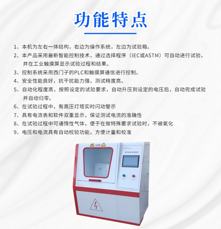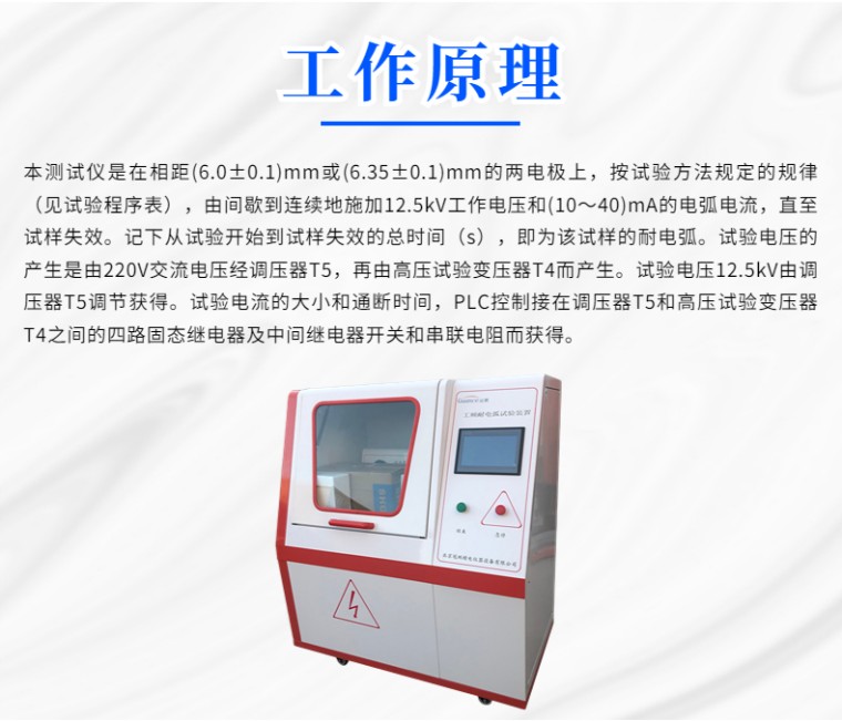 NDH-B 耐电弧测试仪-10寸触摸屏 一 概述 NDH-B型耐电弧试验仪是根据GB/T 1411-2002《固体绝缘材料耐高压低电流电弧放电的试验》(等同IEC 61621-1997)及ASTM D495等标准的要求设计制造的,并符合IEC 149、UL 746A等试验方法。本仪器由绝缘标准制定单位国内绝缘材料标准化技术委员会监制。 主要用于电机、电器及家电等行业的电工用塑料、树脂胶、绝缘漆、以及层压板、覆铜箔板等绝缘材料的耐电弧性能及其分级评定。 二 功能特点 1 本机为左右一体结构,右边为操作系统,左边为试验箱。 2 本产品采用*新智能控制技术,通过选择程序(IEC或ASTM)可自动进行试验,并在工业触摸屏显示试验过程和结果。 3 控制系统采用西门子的PLC和触摸屏通信进行控制。 4 **性能良好,抗干扰能力强,测试精度高。 5 自动化程度高,按照设定的试验要求,自动升压到设定的电压后,自动完成试验并自动归零。 6 在试验过程中,有高压灯塔实时闪动警示 7 具有电流表和软件双重显示,保证测试电流的准确性 8 在试验过程中可通惰性气体,便于在做特殊要求试验时,不被氧化 9 电压和电流具有自动校验功能,方便计量和校准 三 主要技术参数 1 电弧通断时间误差:小于 ±1ms 2 调压器容量:3kVA 3 变压器容量:3KVA,0-20KV 4 额定试验电压:12.5kV 5 试验电压精度:1% 6 电流控制精度:±3% 7电流测量精度:1.5% 8 电极对试样压力:(0.5±0.05)N 9 电极材料:钨棒 10 电极距离:(6.35±0.1)mm(IEC) (6.0±0.1)mm(ASTM) 11 使用环境温度:(23±2)℃ 12 使用环境湿度:(50±5)% 12.输入电压交流220V,输出交流电压0-17.5KV 14.实验电流:10mA—20mA—30mA—40mA 15电源:220V/ 50Hz 四、工作原理 本测试仪是在相距(6.0±0.1)mm或(6.35±0.1)mm的两电极上,按试验方法规定的规律(见试验程序表),由间歇到连续地施加12.5kV工作电压和(10~40)mA的电弧电流,直至试样失效。记下从试验开始到试样失效的总时间(s),即为该试样的耐电弧。试验电压的产生是由220V交流电压经调压器T5,再由高压试验变压器T4而产生。试验电压12.5kV由调压器T5调节获得。试验电流的大小和通断时间,PLC控制接在调压器T5和高压试验变压器T4之间的四路固态继电器及中间继电器开关和串联电阻而获得。 五、结构组成 本仪器分左右结构。左侧上部为小试验箱,内置试验电极系统、高压输出插孔、试验电流表等;用钢化玻璃门封闭,便于观察并确保**。低压接线柱装有高压回路的保护电阻等,左侧下部为高压试验变压器和调压器。 仪器右侧为电气箱,内部有控制系统的PLC和触摸屏以及各种控制电路。 六、实验前准备 1.标准试样至少5块,试样上下表面平整光滑无毛刺飞边。 2.试样厚度在3mm+0.4mm 3.工业酒精若干 4.纸巾若干 5.去离子水 |