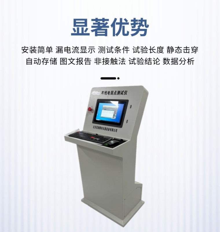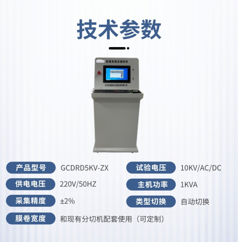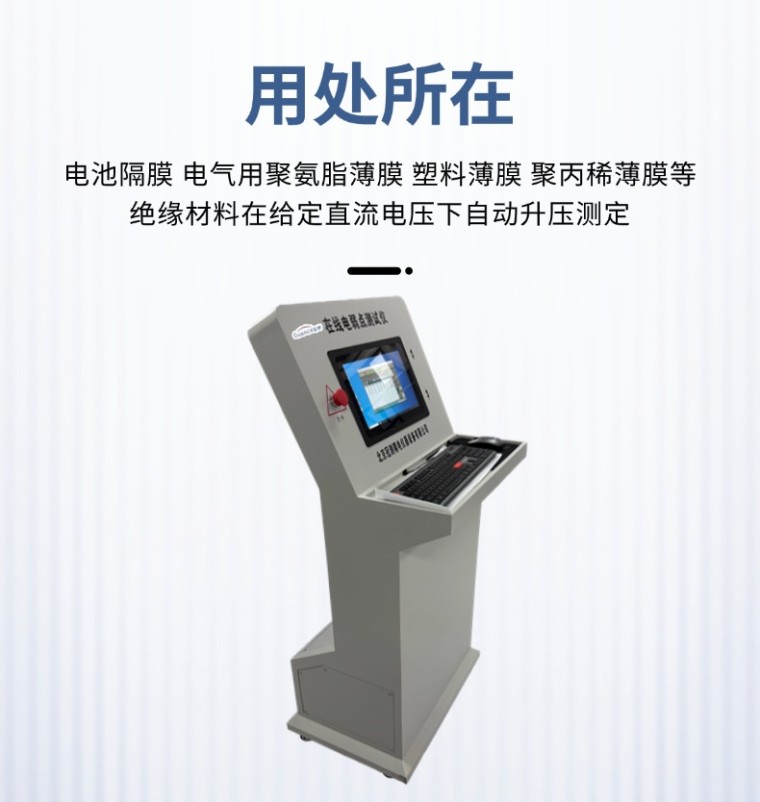 在线电弱点测试仪 GCDRD5KV-ZX 执行标准:GB_T 13542.2-2009 IEC 60674-2:1988-电气绝缘用薄膜 第2部分试验方法产品用途: 该仪器主要用于电气用聚氨脂薄膜、塑料薄膜、聚丙稀薄膜等绝缘材料在给定直流电压下自动升压测定每平方米的击穿点数。 本仪器方式为微机控制,卷膜移动速度可设定,按照设定的升压速率升压,达到设定的电压后,实时记录当前的电压值和电流值,并能够实时记录当前的击穿点,试验结束后自动归零,自动统计电弱点数、电弱线数,自动计算每平方米的电弱点数。 本仪器自动化程度高,操作简单、安装卷膜方便、落地式结构方便操作。 结构组成: 1、升压部件:由调压器和高压变压器组成0~10KV的升压部分。 2、动 部 件:通过调压装置匀速升压到设定的电压值。 3、检测部件:由集成电路组成的测量电路,实时检测测量数据传给计算机。 4、计算机软件:通过智能电路把由检测设备采集的测控信号传给计算机。计算机根据采集的信息控制设备运行并处理试验结果。 5、收卷放卷:固定卷膜并按照设定的速度旋转运动 设备工作原理: 本测试仪试验电压是0-10KV直流电压,其波动为±1%。测试仪在试样弱点击穿后约0.1s内使电压回升到原来设定的电压。铜辊为下电极,导电橡胶为上电极。薄膜以2m-5m /min的速度移动,薄膜弱点时击穿,击穿点自动累积计数。膜移动以平方数自动计数。 优势特点: 1、操作简单:放卷收卷固定后,点开始自动测试 2、动态显示:在薄膜击穿后,同步动态显示曲线,直观可视 3、安装方便:把模卷放入气涨轴,通气自动固定 4、张力可调:同能实时调节收卷、放卷的张力 5、多种模式:测试面积/测试长度/测试时间 6、击穿点判定:实时记录电弱点与测试长度的数据,可以统计查询电弱点之间的长度 7、自动存储:试验介绍后自动弹窗提示存储数据 8、智能自动:本机智能化、自动化程度高,无需专业培训,即可操作 |