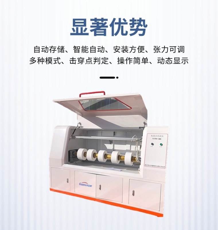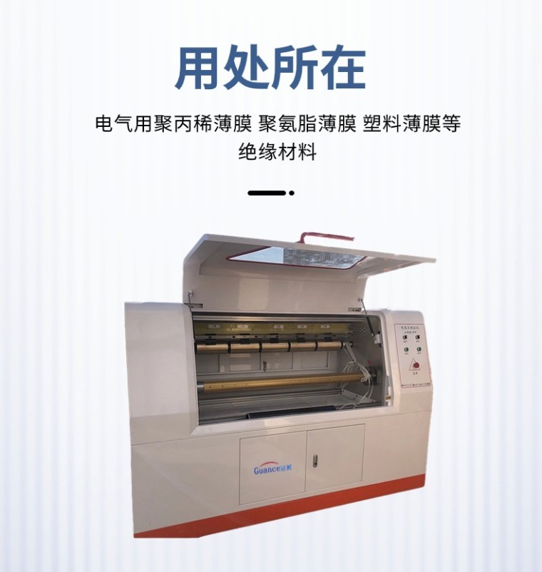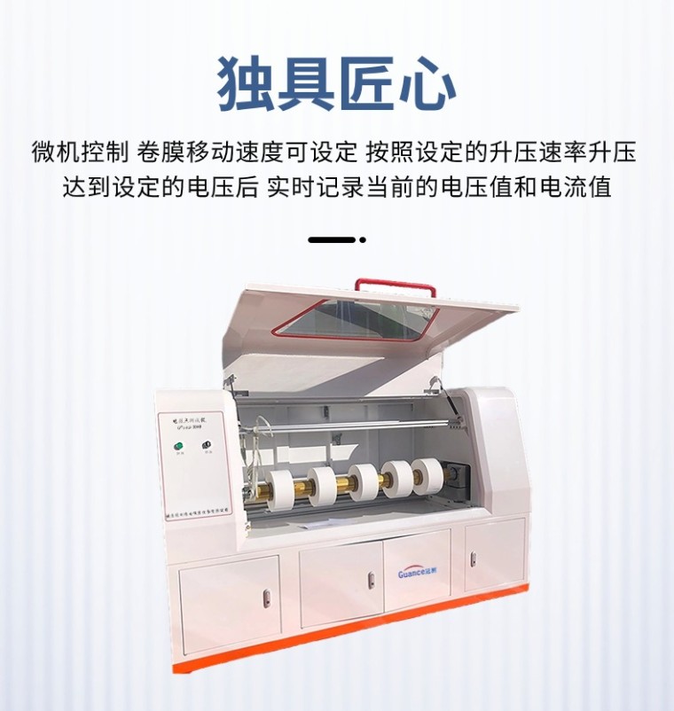 电弱点测试仪-(计算机控制) 产品型号:GCDRD-1000KV 执行标准:GB_T 13542.2-2009 IEC 60674-2:1988-电气绝缘用薄膜 第2部分试验方法 产品用途: 该仪器主要用于电气用聚氨脂薄膜、塑料薄膜、聚丙稀薄膜等绝缘材料在给定直流电压下自动升压测定每平方米的击穿点数。 本仪器方式为微机控制,卷膜移动速度可设定,按照设定的升压速率升压,达到设定的电压后,实时记录当前的电压值和电流值,并能够实时记录当前的击穿点,试验结束后自动归零,自动统计电弱点数、电弱线数,自动计算每平方米的电弱点数。 本仪器自动化程度高,操作简单、安装卷膜方便、落地式结构方便操作。 结构组成: 1、升压部件:由调压器和高压变压器组成0~1000KV的升压部分。 2、动 部 件:通过调压装置匀速升压到设定的电压值。 3、检测部件:由集成电路组成的测量电路,实时检测测量数据传给计算机。 4、计算机软件:通过智能电路把由检测设备采集的测控信号传给计算机。计算机根据采集的信息控制设备运行并处理试验结果。 5、收卷放卷:固定卷膜并按照设定的速度旋转运动 设备工作原理: 本测试仪试验电压是0-1000KV直流电压,其波动为±1%。测试仪在试样弱点击穿后约0.1s内使电压回升到原来设定的电压。铜辊为下电极,导电橡胶为上电极。薄膜以2m-5m /min的速度移动,薄膜弱点时击穿,击穿点自动累积计数。膜移动以平方数自动计数。 优势特点: 1、操作简单:放卷收卷固定后,点开始自动测试 2、动态显示:在薄膜击穿后,同步动态显示曲线,直观可视 3、安装方便:把模卷放入气涨轴,通气自动固定 4、张力可调:同能实时调节收卷、放卷的张力 5、多种模式:测试面积/测试长度/测试时间 6、击穿点判定:实时记录电弱点与测试长度的数据,可以统计查询电弱点之间的长度 7、自动存储:试验介绍后自动弹窗提示存储数据 8、智能自动:本机智能化、自动化程度高,无需专业培训,即可操作 |