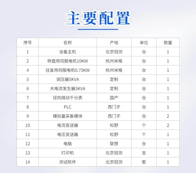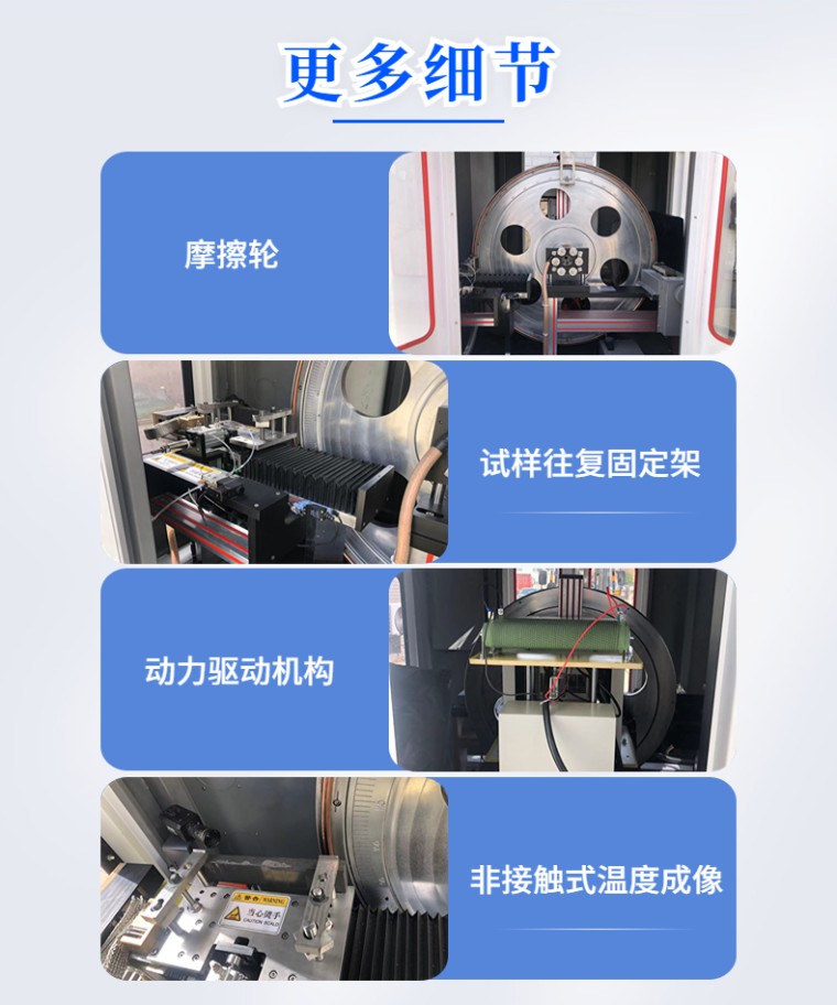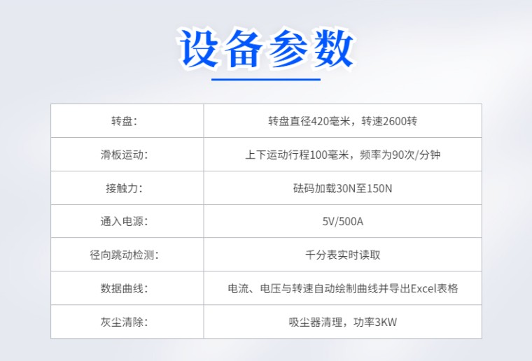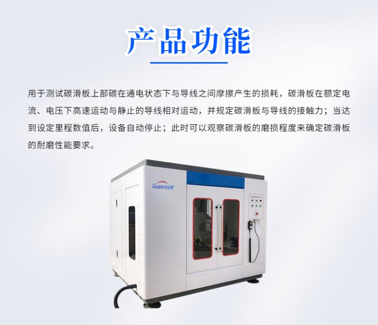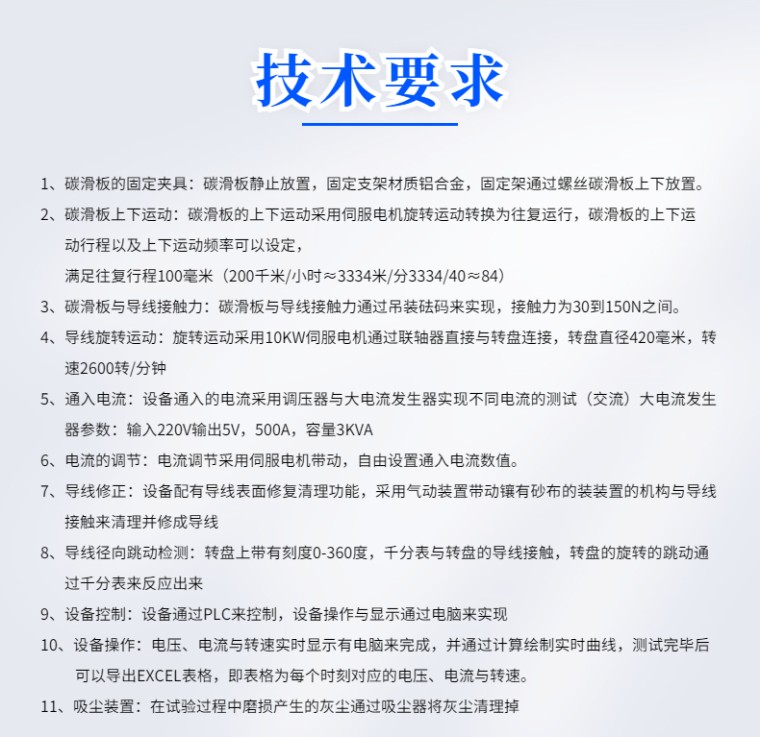 全自动碳滑板摩擦磨损试验机 碳滑板摩擦磨损试验机MCTH-500 一、主要适用范围及功能 设备用于测试碳滑板上部碳在通电状态下与导线之间摩擦产生的损耗,碳滑板在额定电流、电压下高速运动与静止的导线相对运动,并规定碳滑板与导线的接触力;当达到设定里程数值后,设备自动停止;此时可以观察碳滑板的磨损程度来确定碳滑板的耐磨性能要求。 二、使用环境 1、海拔高度:≤1000m 2、环境温度:-30~40℃; 3、环境湿度:≤85%R.H.; 4、大气压力:80~120kPa; 5、供电电源:220±10%VAC / 5 0±0.5Hz / 20KW 6、环境要求:设备四周60cm空间距离,附近没有强电磁辐射源,无可燃性气体、粉尘或混合的环境下使用。 7、耐地震能力:地面水平加速度:3m/s2;地面垂直加速度:1.5m/s2; 8、接地电阻:<1Ω 9、安装地点:室内 10、设备尺寸:长1500毫米宽1000毫米高1700毫米(仅供参考,实际尺寸以实物设计完毕后的尺寸为准) 11、设备重量:600千克 三、主要技术要求 1.碳滑板的固定夹具:碳滑板静止放置,固定支架材质铝合金,固定架通过螺丝碳滑板上下放置。 2.碳滑板上下运动:碳滑板的上下运动采用伺服电机旋转运动转换为往复运行,碳滑板的上下运动行程以及上下运动频率可以设定,满足往复行程100毫米(200千米/小时≈3334米/分钟 3334/40≈84) 3.碳滑板与导线接触力:碳滑板与导线接触力通过吊装砝码来实现,接触力为30到150N之间。 4.导线旋转运动:旋转运动采用10KW伺服电机通过联轴器直接与转盘连接,转盘直径420毫米,转速2600转/分钟 5.通入电流:设备通入的电流采用调压器与大电流发生器实现不同电流的测试(交流)大电流发生器参数:输入220V输出5V,500A,容量3KVA 6.电流的调节:电流调节采用伺服电机带动,自由设置通入电流数值。 7.导线修正:设备配有导线表面修复清理功能,采用气动装置带动镶有砂布的装装置的机构与导线接触来清理并修成导线 8.导线径向跳动检测:转盘上带有刻度0-360度,千分表与转盘的导线接触,转盘的旋转的跳动通过千分表来反应出来 9.设备控制:设备通过PLC来控制,设备操作与显示通过电脑来实现 10.设备操作:电压、电流与转速实时显示有电脑来完成,并通过计算绘制实时曲线,测试完毕后可以导出EXCEL表格,即表格为每个时刻对应的电压、电流与转速。 11.吸尘装置:在试验过程中磨损产生的灰尘通过吸尘器将灰尘清理掉 四、设备参数 1.转盘:1)转盘直径420毫米,转速2600转 2.滑板运动:上下运动行程100毫米,频率为90次/分钟 3.接触力:砝码加载30N至150N 4.通入电源:5V/500A 5.径向跳动检测:千分表实时读取 6.数据曲线:电流、电压与转速自动绘制曲线并导出Excel表格 7.灰尘**:吸尘器清理,功率3KW 五、主要配置 序号名称产地单位数量备注 1设备主机北京冠测台1 2转盘用伺服电机10KW杭州米格台1 4往复用伺服电机0.75KW杭州米格台1 5调压器5KVA定制台1 6大电流发生器3KVA定制台1 7径向跳动千分表国产台1 8PLC西门子台1 9模拟量采集模块西门子台2 10电流变送器松野个2 11电压变送器松野个1 12电脑联想台1 13打印机北京冠测支1 14测试软件北京冠测套1 |