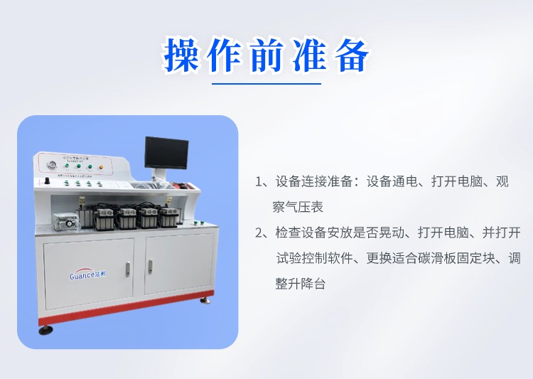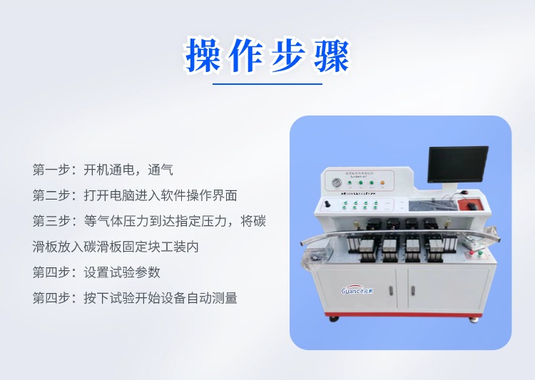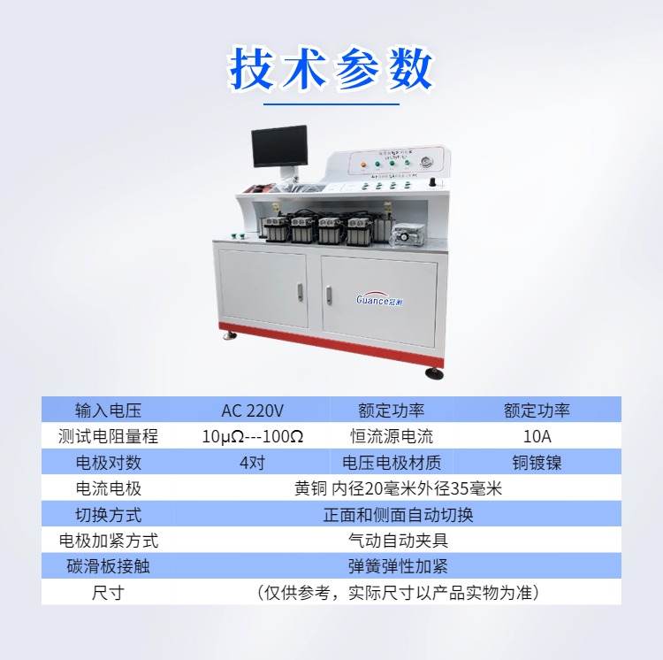 碳滑板电阻测试仪 GCGEST-123 一、概述 设备用于测试碳滑板碳和铝托的电阻的情况。在碳的上表面和铝托的下表面上接通10A的恒定电流测试两边的电压为或者一侧的电压来计算出电阻,通过此方法来判断碳滑板的粘结部分的导电情况和碳滑板的导电率。 二、技术指标: 1、输入电压:AC 220V 2、额定功率:2KW 3、测试电阻量程:10μΩ---100Ω(有效值) 4、恒流源电流:10A 5、电极对数:4对 6、电流电极:黄铜 内径20毫米外径35毫米 7、电压电极材质:铜镀镍 8、电压电极切换方式:正面和侧面自动切换 9、电极加紧方式:气动自动夹具 10、电流电极与碳滑板接触:弹簧弹性加紧 三、整机组成: 1、10A电流:采用大功率恒流源 2、电压采集:与碳滑板接触的触头采用铜合金弹性接触的探针,电压测量分两部分,**部分碳的上表面与铝托下表面之间电压为正面测量,**部分在同一侧碳侧边与铝托侧边之间电压为侧面测量,侧面与正面切换为自动切换 3、电极加紧部分:通过一对双轴气缸来加紧碳滑板,试验时4对气缸同时加紧气缸,通过切换测试电路来取测试碳滑板的电压。 4、气源:设备内部内置静音气泵,设备既可以用内置气泵的气源也可由外界提供气源。 5、控制显示部分:设备内部所有数据的采集和要运算通过原装西门子PLC实现,并通过台式电脑实现数据的传输与显示。 四、操作前准备: 1、设备连接准备: 1)设备通电:主机供电为AC 220V/50Hz功率2KW;主机供电电源线是一根带有16A插头的线缆,需要准备一根带有16A插孔的插排;合上设备右侧下面的总电源开关并按下设备左上方的电源按钮,如果电源指示灯亮起则证明设备内部已经通上电,如果没有亮起需要排查后再进行试验。 2)打开电脑:电脑安装在设备内部,电脑主机开机按钮在显示器下方。 3)气压表:观察气压表的气压范围是否在0.6mpa—0.8mpa,如果气压不在要等气压上升到该范围后才能开始试验,也可根据实际情况来调节气压范围。 2、试验前准备 1)检查设备安放是否有晃动,如果有调整设备地脚使其无明显晃动。 2)打开电脑,并打开试验控制软件 3)准备好碳滑板,并更换好适合该碳滑板固定块。 4)调整升降台高度使其能顶到碳滑板下方以此来稳固碳滑板的位置。 五、设备硬件功能介绍 1)测试中:当设备处于测试中该指示灯会亮起 2)故障:当设备出现故障时该指示灯会亮起 3)压力调节:调节供给气缸的气体压力 4)吸合/释放:对应气缸的打开和关闭 5)气体压力:实时显示供给气缸的气体压力 6)电源(按钮):按下后设备内部通上电源 7)电源(指示灯):当该指示灯亮起证明设备内部已经通上电源 8)右侧USB插座:该USB插座和电脑主机相连 |