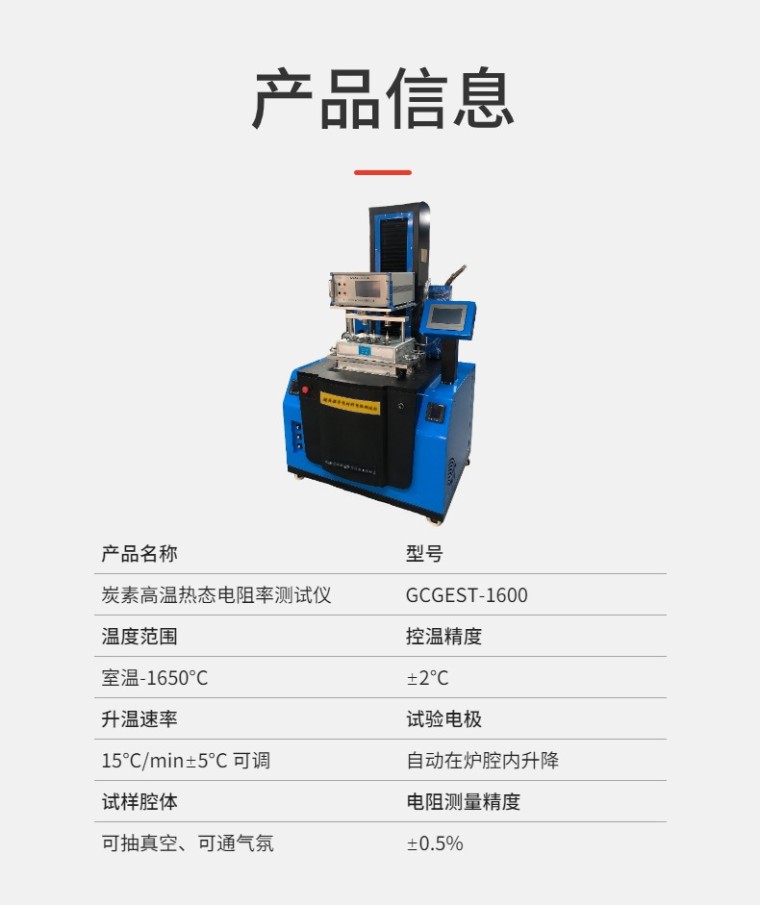 炭素材料热态电阻率测定仪 GCGEST-1600 执行标准:炭素材料热态电阻率测定方法 设备概述: 本仪器核心技术指标按照标准要求订做,具有自动升温、电极自动升降、自动实时记录不同温度下的电阻值,并可以绘制测试曲线并可导出数据和保存电子报告。具有测量精度高、操作方便,智能化程度高等特点。 测试原理: 本方法利用四探针法测试电阻率。在一定温度环境下,利用四根探针接触在试样的表面上,由恒流源给外侧的两根探针提供一个适当的电流,测量试样中间两根探针的电压,根据欧姆定律得出热态电阻率。 本仪器设备组成主要由以下部分组成: 设备用途: 本仪器按照设定的升温速率达到设定的温度后,在高温真空或气氛状态下测试试样的电阻率 核心技术指标: 1、温度范围:室温-1650℃ 2、升温速率:15℃/min±5℃ 可调 3、控温精度:±2℃ 4、试样腔体:可抽真空、可通气氛 5、试样尺寸:直径10mm、长度80mm 6、试样数量:1组/2组/3组/4组(可选) 7、试验电极:可以自动在炉腔内升降 8、测试电流:10μA, 100μA, 1mA, 10mA, 100mA, 500 mA ,1A, 5A,10A. 9、电阻测量精度:±0.5% |