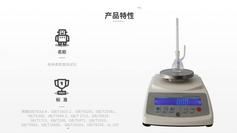 粉体真密度测试仪 测试标准: 根据GB/T533-A 、GB/T1033.1、 GB/T6155、GB/T23561、YB/T5300、JB/T7984.3、GB/T 1713、 GB/T8929、GB/T1713、GB/T208、GB/T5071、QB/T1010、GB/T9966、GB/T18856 、GB/T24203、GB/T8330、SL-237等。 测试原理: 应用阿基米德浮力法,配合专用比重瓶,准确的读取粉末的密度,相对密度。 行业应用: 硫化橡胶、非泡沫塑料、炭素真密度、岩石、煤真密度、沥青焦真密度、普通磨料密度、颜料密度、固体和半固体石油沥青密度、颜料、水泥粉末、防火材料、陶瓷材料、天然石材、水煤浆密度、炭素材料真密度煮沸法、土壤真密度测试法、离子树脂湿真密度、离子树脂湿真密度、粉末真密度研究实验室。 技术参数: