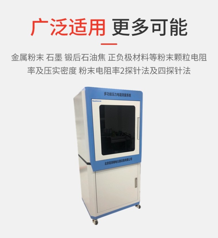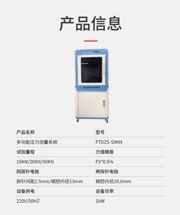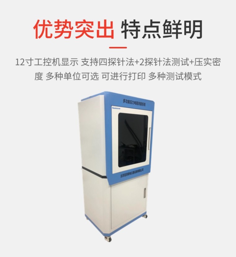 多功能压力测量系统 FTDZS-50KN 参考标准:GBT 30835-2014 锂离子电池用炭复合磷酸铁锂正极材料-粉末四探针法 GBT 24521-2018 炭素原料和焦炭电阻率测定方法 GBT 24533-2019 锂离子电池石墨类负极材料-粉末压实密度的测试方法 产品用途: 本机为多功能试验仪器,可以用于各种粉末颗粒电阻率及压实密度的测试。 适用对象:主要用于金属粉末、石墨、锻后石油焦、正负极材料等粉末颗粒电阻率测试及压实密度测试,粉末电阻率测试支持2探针法测试及四探针法测试 一、产品概述: 本仪器主机为通用试验仪器,可以选配多种测试工装及测试电极,来选择适合自己当前测试需求的配置,同时还可以为后期的其它类型材料测试,进行拓展和延伸,本仪器是一台一机多用、配置灵活、功能强大的高精度电阻率测试仪器。 本仪器显示及操作方式由嵌入式工控机操作实现,页面布局合理,人性化设计,可对测试结果进行打印。 仪器具有测量精度高、稳定性好、结构紧凑、使用方便等特点,完全符合国际和国家标准的要求。 本仪器结构组成以下部分组成: 1、力值加载系统:由伺服电机为动力源进行加载,控制压力,无噪音,连续加载 2、电阻测量系统:电阻测量范围宽,满足多种测试量程的需求 3、系统控制采集:12寸工控机软件显示,页面实时显示测试数据,并可以打印测试数据 4、专用测量电极:四探针电极/两探针法电极/压实密度模腔 二、优势特点: 1、12寸工控机软件显示, 2、同时支持四探针法+2探针法测试+压实密度 3、测试过程实时显示压力、压强、压缩厚度、压缩密度、电阻、电阻率、电导率 4、电阻率显示单位及电导率多种单位可选 5、可对单点测试的试验结果进行打印 6、多种测试模式:恒压力、恒压强、梯度压力、梯度压强、压缩比 7、梯度多点测试结果,能够自动统计各梯度之间的电阻差值,并自动计算百分比 8、可以梯度模式测试的结果进行在线查看及数据导出 9、测试过程全自动化,试验完成后自动复位 |