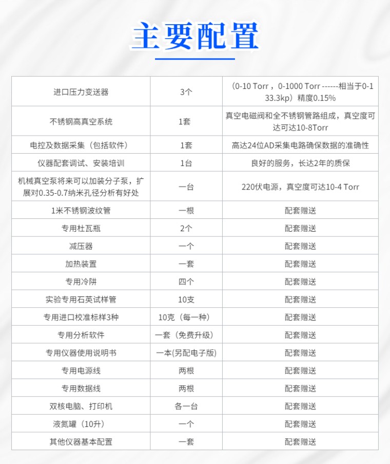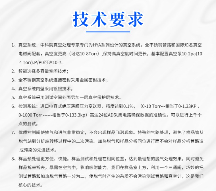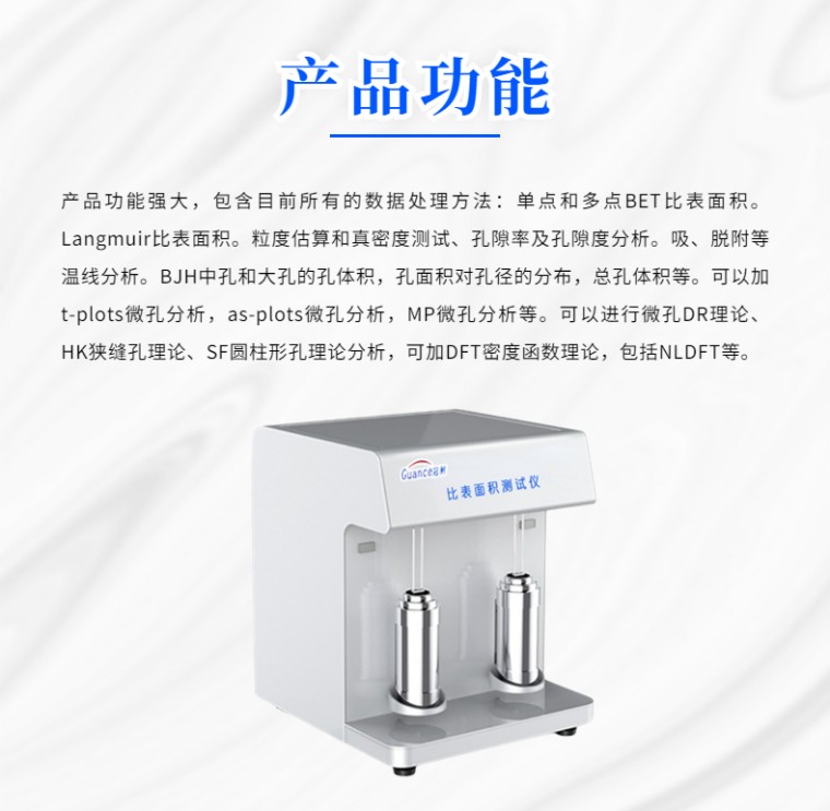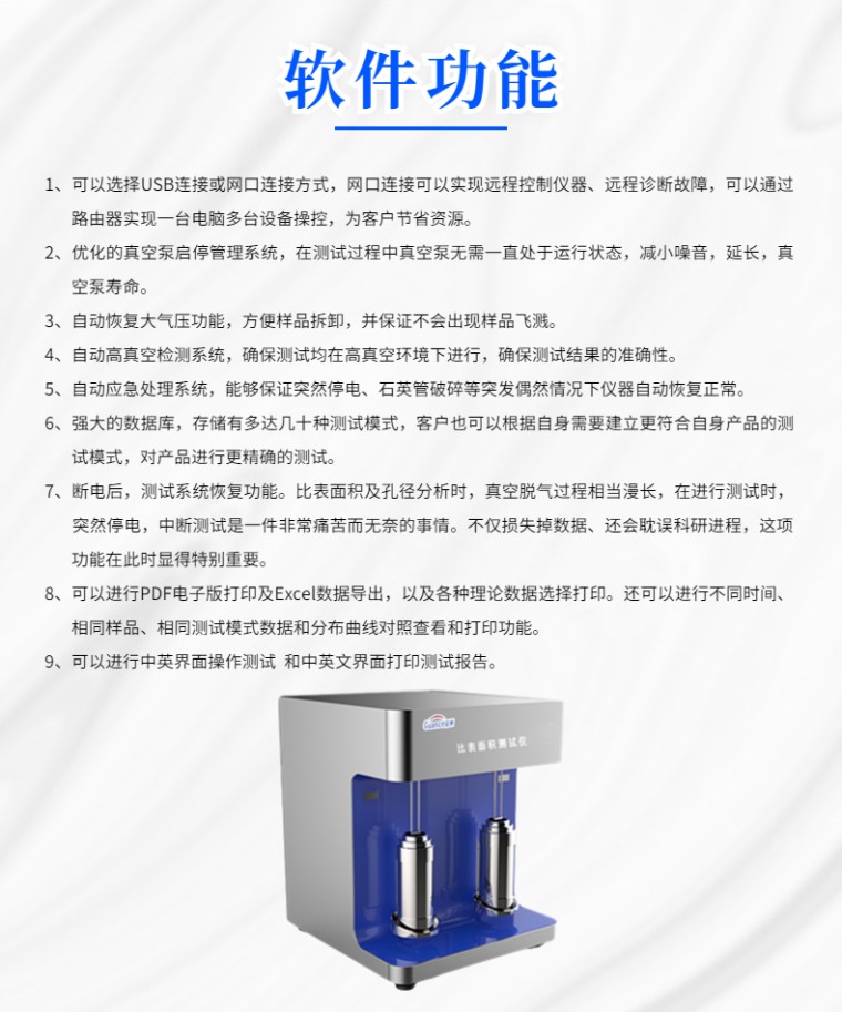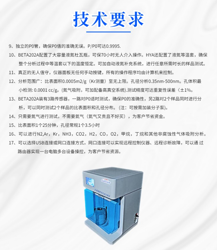 比表面积及孔径测试仪 BETA202A 一、适用范围及功能 1)适用产品多:包括测量建材、石墨、电池材料、沸石、碳材料、分子筛、二氧化铝、土壤、有机化合物等粉体以及各种块材、片材、高分子纤维等。 2)功能强大,包含目前所有的数据处理方法:单点和多点BET比表面积。Langmuir比表面积。粒度估算和真密度测试、孔隙率及孔隙度分析。吸、脱附等温线分析。BJH中孔和大孔的孔体积,孔面积对孔径的分布,总孔体积等。可以加t-plots微孔分析,as-plots微孔分析,MP微孔分析等。可以进行微孔DR理论、HK狭缝孔理论、SF圆柱形孔理论分析,可加DFT密度函数理论,包括NLDFT等。 二、软件功能: 1)可以选择USB连接或网口连接方式,网口连接可以实现远程控制仪器、远程诊断故障,可以通过路由器实现一台电脑多台设备操控,为客户节省资源。 2)优化的真空泵启停管理系统,在测试过程中真空泵无需一直处于运行状态,减小噪音,延长,真空泵寿命。 3)自动恢复大气压功能,方便样品拆卸,并保证不会出现样品飞溅。 4)自动高真空检测系统,确保测试均在高真空环境下进行,确保测试结果的准确性。 5)自动应急处理系统,能够保证突然停电、石英管破碎等突发偶然情况下仪器自动恢复正常。 6)强大的数据库,存储有多达几十种测试模式,客户也可以根据自身需要建立更符合自身产品的测试模式,对产品进行更**的测试。 7)断电后,测试系统恢复功能。比表面积及孔径分析时,真空脱气过程相当漫长,在进行测试时,突然停电,中断测试是一件非常痛苦而无奈的事情。不仅损失掉数据、还会耽误科研进程,这项功能在此时显得特别重要。 8)可以进行PDF电子版打印及Excel数据导出,以及各种理论数据选择打印。还可以进行不同时间、相同样品、相同测试模式数据和分布曲线对照查看和打印功能。 9)可以进行中英界面操作测试和中英文界面打印测试报告。 三、技术要求: 1、真空系统:中科院真空处理专家专门为该系列设计的真空系统,全不锈钢管路和国际知名真空电磁阀配套,真空度更高(可达10-8Torr),保持高真空度时间更长。基本配置真空泵10-2pa(10-4 Torr).P/P0可达10-7. 2、智能选择多容量空间技术; 3、全不锈钢真空系统连接密封采用金属密封技术; 4、真空系统内壁采用镀银技术。 5、真空系统采用测试空间外面另加一层真空保护层技术。 6、检测系统:进口电容式绝压薄膜压力变送器,精度达到0.1%,(0-10 Torr---相当于0-1.33KP ,0-1000 Torr ------相当于0-133.3kp)高达24位AD采集电路确保数据的准确性。可以进行上千个点的测试。 7、上等控制阀使抽气和进气非常稳定,不会出现样品飞溅现象。特殊的气路处理,避免了样品管从脱气站到分析站转移过程中的二次污染。加热脱气和样品分析同位进行而不会对样品分析管路造成污染的先进技术。 8、样品预处理更方便、快捷。样品测试和处理在相同位置,达到理想的脱气处理效果。同时避免样品拆来拆去,暴露在空气中,影响吸附能力。我们在样品室上方,利用一个三通阀,巧妙的把测试管路和加热脱气管路一分为二,使脱气时产生的杂质不会污染测试管路和真空计,这是我们核心的技术。 9、独立的P0管,确保P0值的准确无误。P/P0可达0.9995 10、BETA202A配置了大容量液氮杜瓦瓶,可保70小时无人介入操作。HYA还配置了液氮等温套,以确保整个分析过程中等温套以下的温度恒定。可加自动液氮补充系统,进行任意所需时长的样品测试。 11、真正的无人值守,仪器面板无任何手动按键,所有的操作程序均由计算机来控制。 12、分析范围广:比表面积0.0005m2/g(Kr测量)至无上限。孔径分析0.35nm-500nm。孔体积小检测: 0.0001 cc/g。(氮气吸附,可加配备高真空系统).测试精度可达重复性误差〈±1%。 13、BETA202A装有3路传感器,一路对P0适时测试,确保P0的准确性,另2路对2个样品同时进行分析,可以同时测试2个样品的比表面积和孔径分布。 (注:可按需加装分子泵)。 14、只需要氮气进行测试,不需要氦气(氦气又贵且不好买),为客户节省资金。 15、比表面积1个25分钟,孔径常规1个3.5小时 16、可以进行N2,Ar,Kr,NH3,CO2,H2,CO,O2,甲烷,丁烷和其他非腐蚀性气体吸附分析。 17、可以选择USB连接或网口连接方式,网口连接可以实现远程控制仪器、远程诊断故障,可以通过路由器实现一台电脑多台设备操控,为客户节省资源。 四、**保护: 本仪器具有比较完善的**防护措施: 本试验仪器电路保护控制: (1)超压保护 (2)过流保护(3)短路保护 (4)漏电保护 (5)软件误操作保护 |