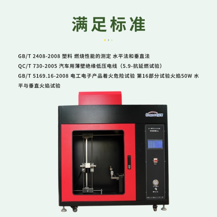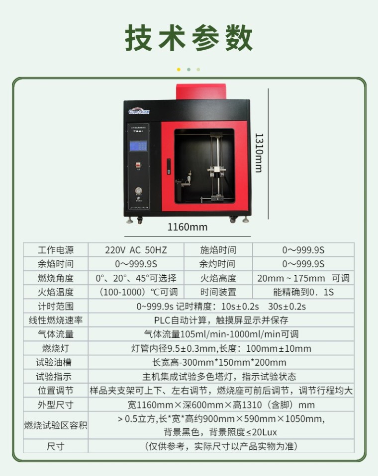水平垂直燃烧试验仪-触摸屏显示 产品名称:水平垂直燃烧试验仪 产品型号:GCSCRS-A 满足标准: GB/T 2408-2008 塑料 燃烧性能的测定 水平法和垂直法 QC/T 730-2005 汽车用薄壁绝缘低压电线(5.9-抗延燃试验) GB/T 5169.16-2008 电工电子产品着火危险试验 第16部分试验火焰50W 水平与垂直火焰试验 适用范围 用于测试塑料类及非金属材料类物质燃烧性能的试验仪器。适用于塑料和非金属材料试样处于50W火焰条件下,水平或垂直方向燃烧性能的试验室测定方法。 产品功能特点 1.可编程控制器触摸屏+PLC控制,实现控制/检测/计算/数据显示多功能 2.自动化程度高:自动记录试验时间,自动显试结果,自动计时,自动点火,施焰结束后本生灯自动退回,可选择是否关闭燃气 3.启动时可选择是否自动点火 4.式样夹前、后、上、下进退均可触摸屏操控,启动、停止、燃气、计时、点火、保存、保存、照明、排风均通过触摸屏控制实现,指尖轻触即可完成试验 5.计时按钮配合PLC自动记录储存燃烧耗时间 6.试验时间系统自动记录,并生成试验结果 相关技术参数 ①仪器合适工作条件及主要技术指标 环境温度:室温~40℃; 相对湿度:≤75%; 供电电压和功率:220V±10% 50HZ 功率150W 水平与垂直燃烧测试程序在触摸屏上可切换,试验结果可存储在触摸屏内,试验结果可查询; 本生灯自动点火,自动计时,点火时间任意设定(可在触摸屏上预设) 本生灯内径9.5mm±0.5mm 本生灯启动前可选择是否自动点火 施加火焰完毕本生灯自动退回,本生灯退回是可选择是否关闭燃气 气源:液化石油气(仲裁时加工业甲烷气); 钢板静电喷箱体 大于0.5立方米(支持非标定做0.75m³、1m³大小及不锈钢材质箱体) 仪器重量约:100kg 工作电源 : 220V AC 50HZ 计时范围:0~999.9s 记时精度:10s±0.2s 30s±0.2s; 施焰时间 : 0~999.9S(可调,可在触摸屏上预设) 余焰时间 : 0~999.9S 余灼时间 : 0~999.9S 线性燃烧速率(V)PLC自动计算,触摸屏显示并保存 燃烧角度 : 0°、20°、45°可选择 火焰高度 : 20mm ~ 175mm 可调 火焰温度:(100-1000)℃可调 气体流量 : 气体流量105ml/min-1000ml/min可调 燃 烧 灯 : 灯管内径9.5±0.3mm,长度:100mm±10mm 时间装置 : 能**到0.1S 位置调节 : 样品夹支架可上下、左右调节,燃烧座可前后调节,调节行程均大 外型尺寸:宽1160mm×深600mm×高1310(含脚)mm 燃烧试验区容积:>0.5立方,长*宽*高约900mm×590mm×1050mm, 背景黑色,背景照度≤20Lux 顶部配有静音且防回流排风装置,试验结束后可排出燃烧所产生烟气 ②设计标准: GB-T2408-2008《塑料燃烧性能的测试-水平法和垂直法》(ANSI/UL94 -2006) GBT10707-2008《橡胶燃烧性能的测定 》方法B(即GB-T13488《橡胶燃烧性能测定—垂直燃烧法》) ③适用标准: GJB360B-2009 电子及电气元件试验方法 111 GB/T5169.16-2008 ANSI/UL94 IEC60950-1、 IEC695-2-2 ②设计标准: GB-T2408-2008《塑料燃烧性能的测试-水平法和垂直法》(ANSI/UL94 -2006) ③适用标准: GB-T13488《橡胶燃烧性能测定—垂直燃烧法》 GB/T5169.16-2008 ANSI/UL94 IEC60950-1、 IEC695-2-2 四、产品配置 1.设备主机 壹台 2.电源线 壹根 3.滴落盘 壹只 4.点火器 壹只 5.螺丝刀 壹只 6.紧箍 贰个 7.气源管 壹点伍米 8.备用标尺 壹把 9.说明书 壹份 10.合格证 壹张 |