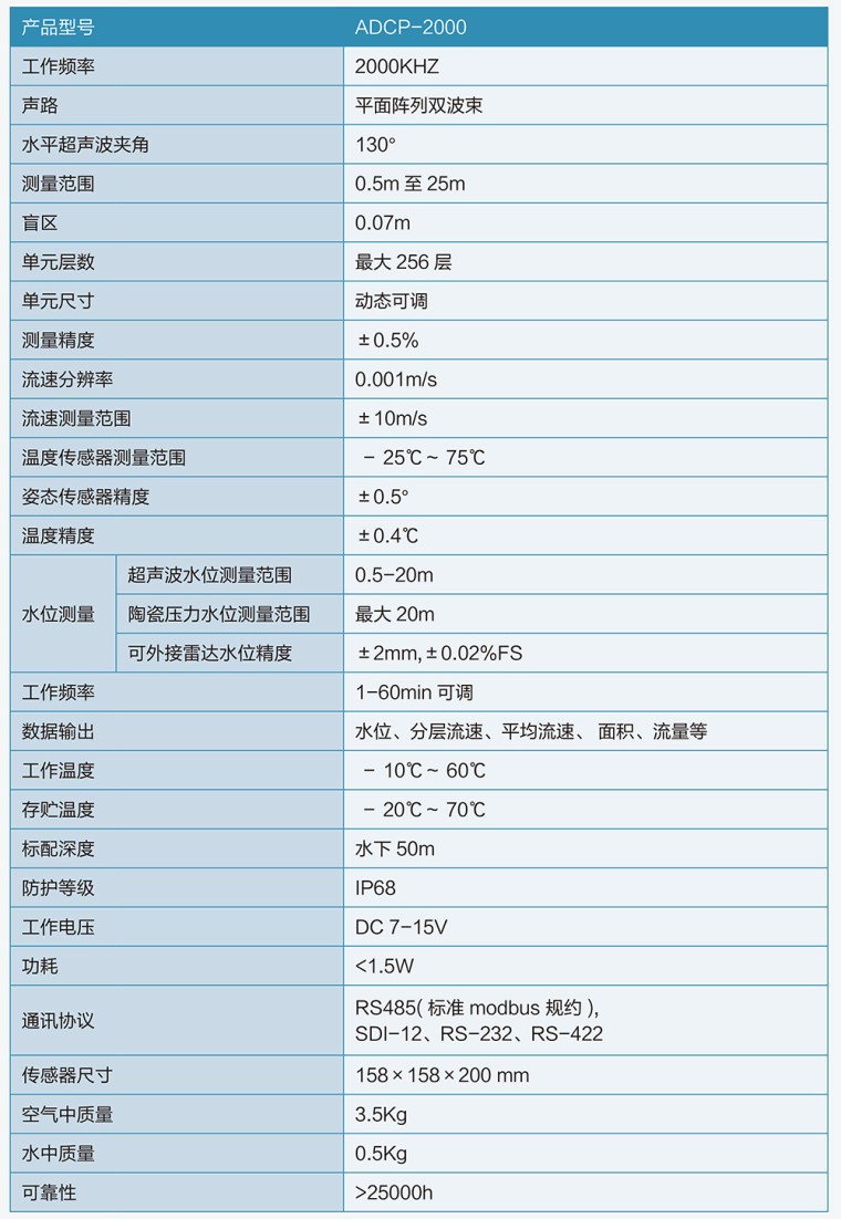 在河流、渠道的水文测验工作中,流速、流量和流向的测量是很重要的工作,传统的流量测验方法主要有流速仪法、浮标法等,测验手段有人工船测、缆道测量等,这些测验方法原理简单明了、实用性强,但是费工费时,效率低。为适应新时代经济社会发展和防汛工作的需求,及时想各级防汛抗旱部门提供准确的水文信息,特别在大洪水时,需要快速采集河流的洪水流量数据,声学多普勒流量仪测流有不可比拟的优越性。 应用于水文、水利、排水、灌区、海绵城市的渠道、河道流速流量测量 ADCP2000 系列成为功能强大的测流系统。采集高质量的水平剖面数据。采用侧式的安装方式,借助于智能声波脉冲功能,即使水流条件发生变化,仍然可以获得高分辨率和高质量的数据。特别适用于:混凝土渠道、天然河流、小溪、灌溉渠道、水电水道、排水渠道。 ■ **代流速产品,性能更稳定测量更精确; ■ 分层流速测量,更适应宽流域的流速分布; ■ 分层流速流向测量,掌握水体的流动趋势; ■ Web 云端数据服务; ■ 内置水深测量探头; ■ 流量仪简单易用; ■ 内置温度传感器,自动校准声速; ■ 内置姿态传感器、水位传感器测量; ■ 外形小型及流线型的设计,方便安装。