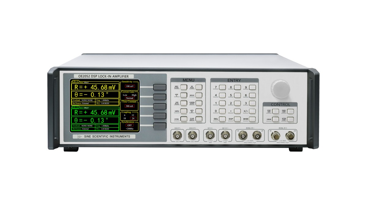 DC-400 MHz双通道锁相放大器 测量频率范围:1 μHz - 400 MHz 2路独立同步的输入通道 噪声低至4nV/√Hz 动态储备高达120 dB 2路信号发生器 示波器、频谱分析仪 PID自动控制 输入信号通道 OE2052配备了低噪声模拟前端放大器,能够高效处理差分信号或单端信号,等效输入噪声低至3nV/√Hz。该通道的输入阻抗可选择50Ω或10MΩ,满量程灵敏度范围为1nV至1V,动态范围可以达到120dB以上。此外,信号输入通道采用双ADC设计,兼顾高速与高精度测量需求,用户可根据实际应用场景选择高速14位ADC(支持DC至400MHz频段)或高精度24位ADC(支持DC至100kHz频段)。 输出信号通道 OE2052基于1GSPS 16位数模转换器(DAC),能够在1Hz至400MHz的频率范围内生成正弦波信号,并可调节直流偏置。在50 Ω负载下,信号幅值范围为1Vpp至1.5Vpp,直流偏置范围为±1.5Vdc。对于需要偏置电压的外部设备,如电光调制器,OE2052凭借其**的驱动能力,可以直接驱动设备而无需额外的电平转换放大器。输出信号的相位与仪器内部振荡器保持同步,并且可以独立设置相位偏移。 参考信号通道 锁相放大器的参考信号可根据用户实际需求选择正弦波或方波信号,也可采用仪器内部数字合成的参考信号。当OE2052设置为内部参考信号模式时,仪器内部的高精度振荡器和数字合成算法将生成用于与输入信号相乘的正弦波信号,且该内部参考信号几乎不受相位噪声的影响。通过数字移相技术,内部参考信号的相位分辨率可达到1udeg。 当OE2052工作在外部参考信号模式,可接受正弦波信号或TTL逻辑电平作为外部参考信号,这一信号会被内部数字锁相环锁定。基于参考信号的频率,OE2052可以对信号同频及其谐波进行检测,最多可检测到基频的65535次谐波,但最大谐波频率不能超过仪器的测量带宽上限。 数字解调器 OE2052的时间常数可在25ns至4ks范围内灵活设置,用户可根据需求自定义时间常数。滤波器的陡降速率可以选择6 - 48 dB/oct共8阶。采用数字调制技术与先进滤波器结构,OE2052相比传统模拟锁相放大器,具有更高的动态储备(>120dB)、更精确的相位(**相位误差<1°)、零直流漂移以及优异的正交性能。此外OE2052提供可选的同步滤波器,能有效消除参考信号谐波的影响,确保仪器在快速响应的同时,准确检测低频信号。 显示功能 OE2052配备了一块5.6英寸、640×480分辨率的TFT彩色显示屏,作为仪器的主要显示界面,并可通过键盘实现对仪器的全方位独立控制。在显示屏上,用户可以灵活查看解调器的X、Y、R、θ等参数,同时还可以进行滤波器常数等多种基础设置的配置,操作直观便捷。