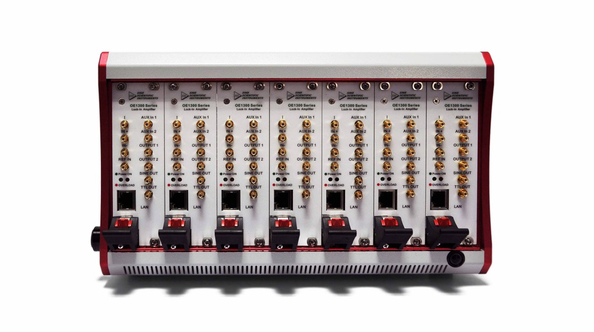 DC-1 MHz多通道锁相放大器 测量频率范围:1 μHz - 100kHz/500kHz/1MHz 通道数:3-10通道可选 满量程灵敏度:1 nV - 5 V 噪声低至5nV/√Hz 动态储备高达130dB 每个通道8个任意频率解调器 附带频谱分析、示波器功能 扫描显微镜 AFM、STM、SPM 材料科学 载流子迁移率、载流子密度、霍尔效应、超声材料 输运测量 电导测量,阻抗测量 噪声表征 噪声密度,互相关测量 光学实验 光谱分析、光谱测量、THz测量、TDLAS 传感器测量 陀螺仪、光电传感器、谐振器、加速度计 磁性传感 SQUIDs, NV色心, 原子磁强计,VSM 生物医疗 微流控 性能参数 每个锁相单元参数 信号通道 电压输入模式 单端或差分输入 满量程灵敏度 1 nV至5 V,以1-2-5的倍数顺序步进 电流输入增益 10^6 V/A 输入阻抗 电压 10 MΩ//10 pF,交流或直流耦合 电流 1 kΩ到虚拟地 共模抑制比 >70 dB至10 kHz,以 6 dB/oct 减小 动态储备 >120 dB 增益精度 标准 0.5%,最大 2% 电压噪声 997 Hz时 5 nV/√ Hz 参考通道 输入 频率范围 1 μHz至100 kHz/500 kHz/1 MHz 参考输入 方波或正弦波 输入阻抗 10 MΩ 方波参考电平 VIH>3V,VIL<0.5V 正弦参考信号 >2 Hz 相位 >400 mVpp 相位 分辨率 1 udeg **相位误差 < 1 deg 相对相位误差 <0.001 deg 正交性 内部参考 在1 kHz时: <0.0001° rms 外部参考 在1 kHz时: 0.005° rms(时间常数100 ms, 12 dB/oct) 温漂 低于10 kHz <0.01°/℃ 高于10 kHz <0.1°/℃ 谐波检测 2F, 3F, …nF 至 100/500 kHz (n<65,535) 采集时间 内部参考 即时采集 外部参考 (3个周期+5 ms)或者40 ms 解调器 稳定性 数字输出 所有设置均无零点漂移 显示 所有设置均无零点漂移 模拟输出 所有动态储备设置小于5 ppm/℃ 谐波抑制 -90 dB 时间常数 1 us至3 ks . 6, 12, 18, 24,30,36,42 ,48dB/oct陡降 同步滤波器 低于1 kHz且大于18 dB/oct陡降有效 信号发生器 频率 范围 1 μHz至100 kHz/500 kHz/1 MHz 精度 2 ppm+10 μHz 分辨率 1 uHz 失真 -70 dBc 正弦幅值 0.001 Vrms至5 Vrms (分辨率1 mVrms) 误差 标准0.5% (f<10 kHz),最大2% 温度稳定性 100 ppm/℃ 正弦输出 正弦信号,输出阻抗50 Ω TTL同步输出 5 V TTL/CMOS电平,输出阻抗200 Ω 辅助输入与输出 CH 1 和 CH 2 功能 输出X,Y,R,θ和谐波 幅值 ±10 V 驱动电流 ±30 mA max AUX Inputs 功能 2通道输入 幅值 ±10 V,1 mV分辨率 阻抗 1 MΩ 多通道系统参数 通讯接口 RS-232 标准9阵RS-232母插座 USB2.0 USB 2.0高速通讯接口 Enternet 1 Gbps 千兆网络通讯接口 其他 电源要求 电压 220-240 VAC(110-120 VAC可选) 频率 50 Hz / 60 Hz 功率 50 W到200 W(增加通道数功率增) 电源噪声抑制 70 dB@1 MHz |