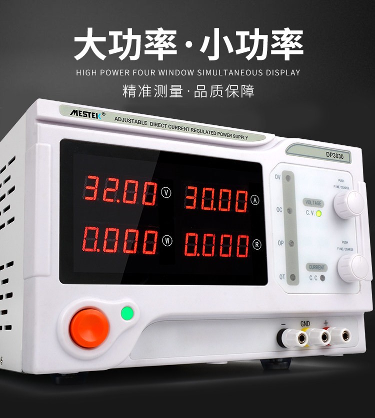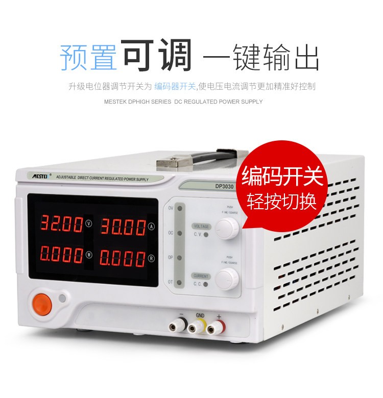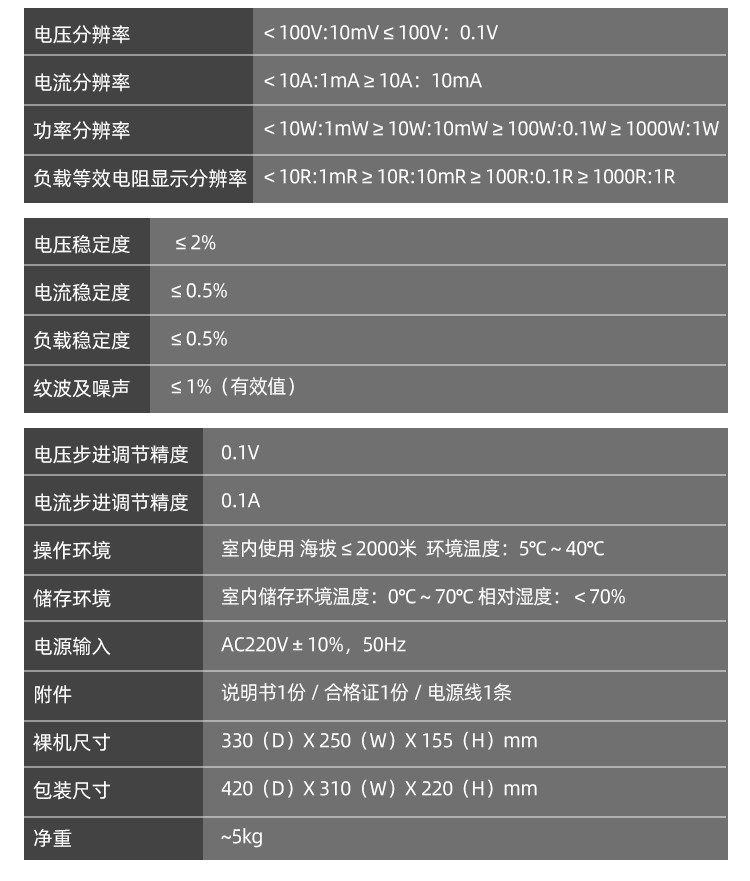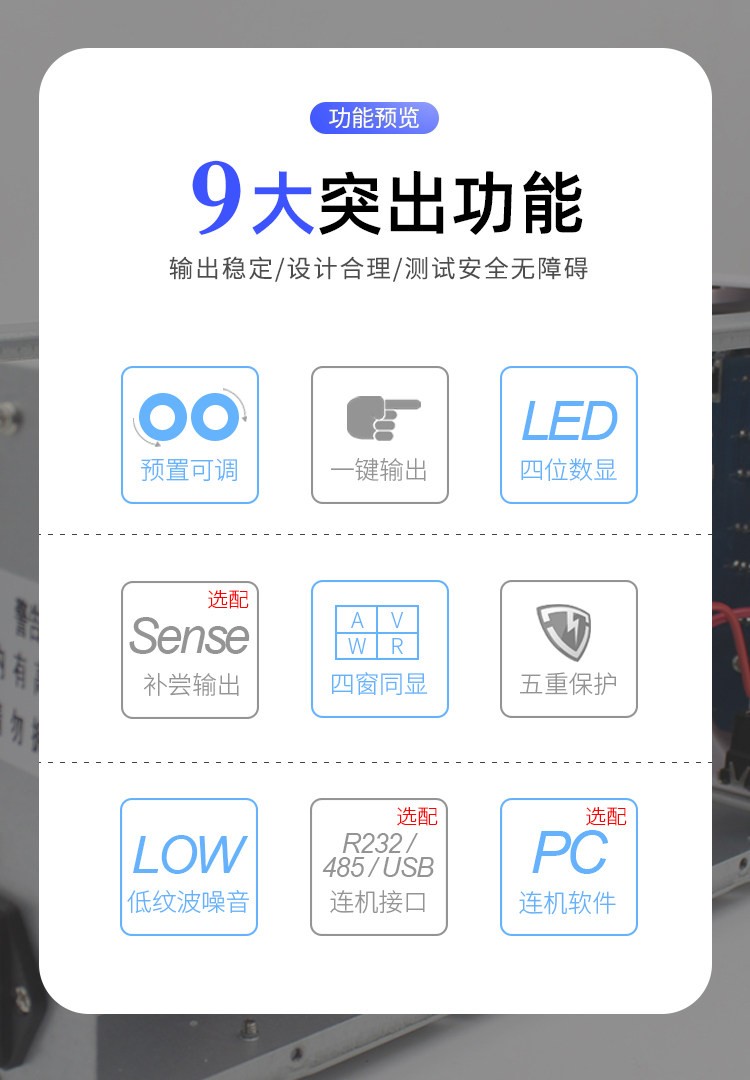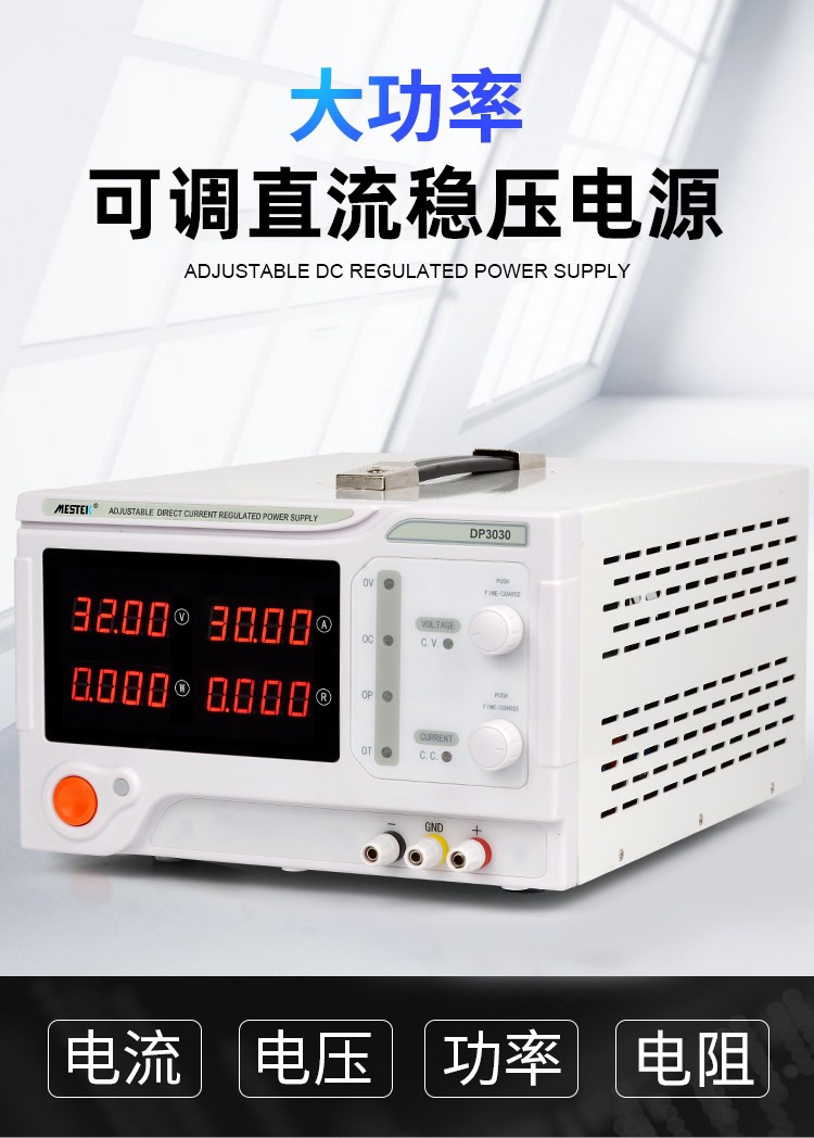 1、彩色四位数显示 2、900W大功率输出 3、输出功率/电压/电流:900W/0-30V/0-20A 4、电源电压:AC220V/AV110V可选 5、电压分辨率:<100V:10 mV,≥100V:0.1V- 6、电流分辨率:<10A:1 mA,≥10A:10 mA 7、功率分辨率:<10W:1mW,≥10W:10mW/2100W:0.1W/21000W:1W 8、电压/电流/负载/波动精度:<2%/≤0.5%/≤0.5%/1 9、电压/电流阶梯调整分辨率:0.1V/0.1A 10、电压/电流波动:≤20mV RMS/≤100mA RMS 11、产品尺寸/重量:330(长)*250(宽)*155(高)mm / 约5kg 卖点:1、感应补偿输出接口可选:USB/485/232 2、恒压/恒流自动切换 3、步数可调,编码开关