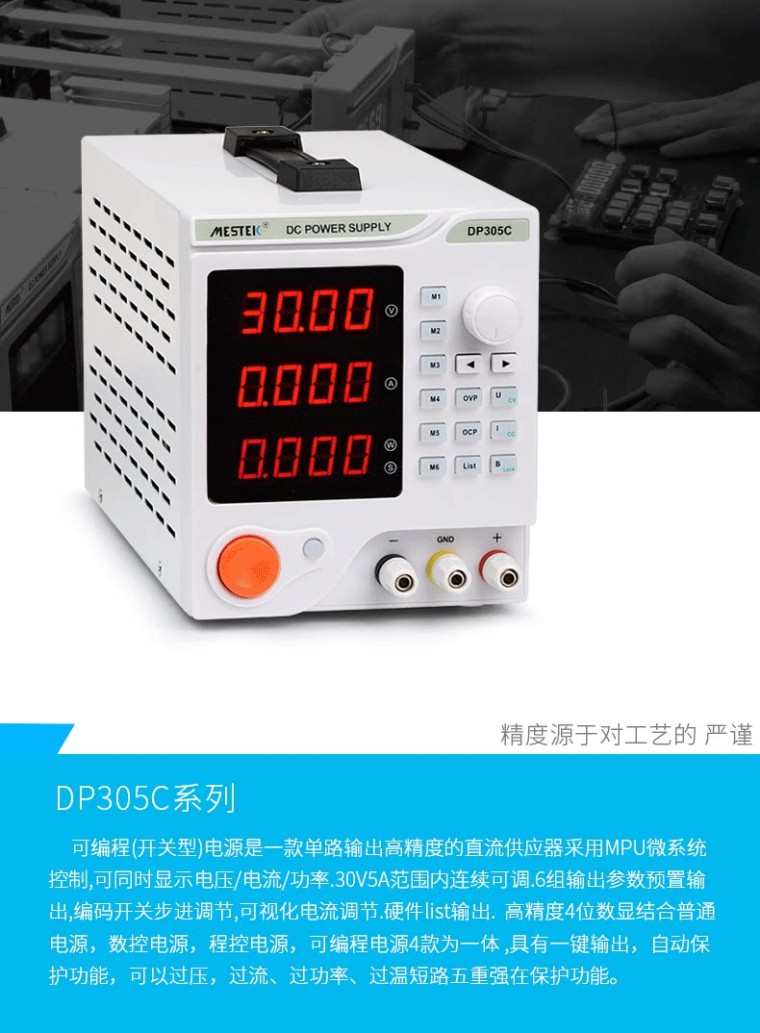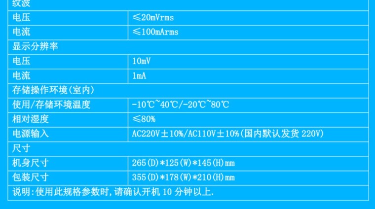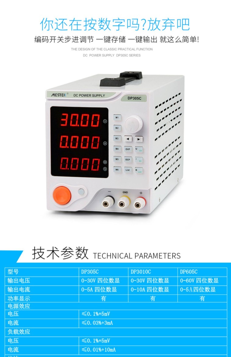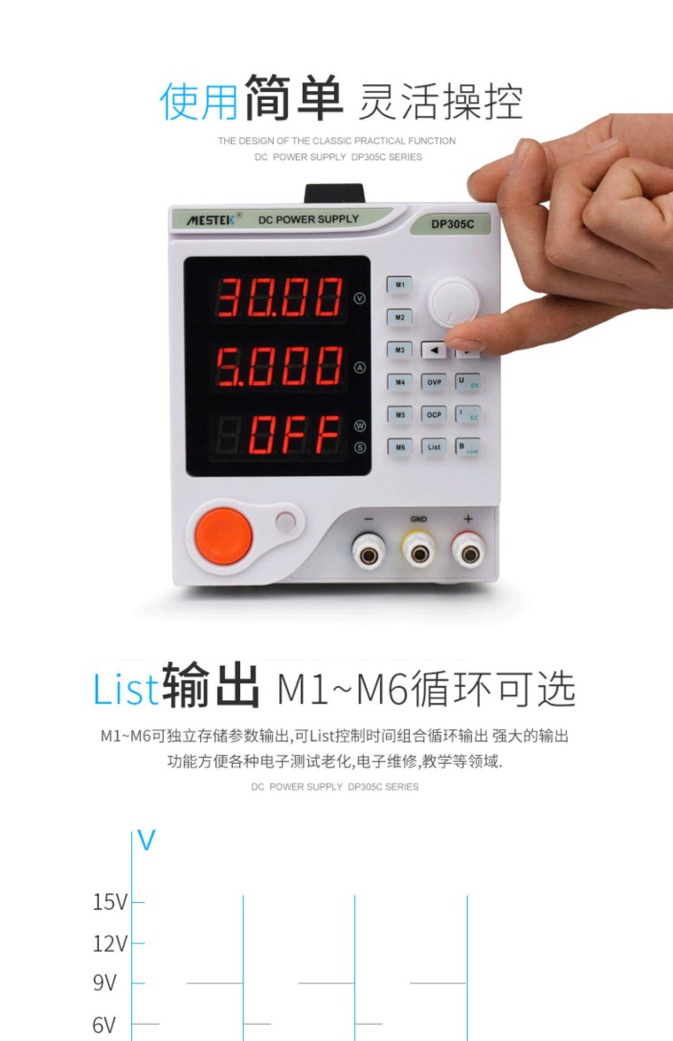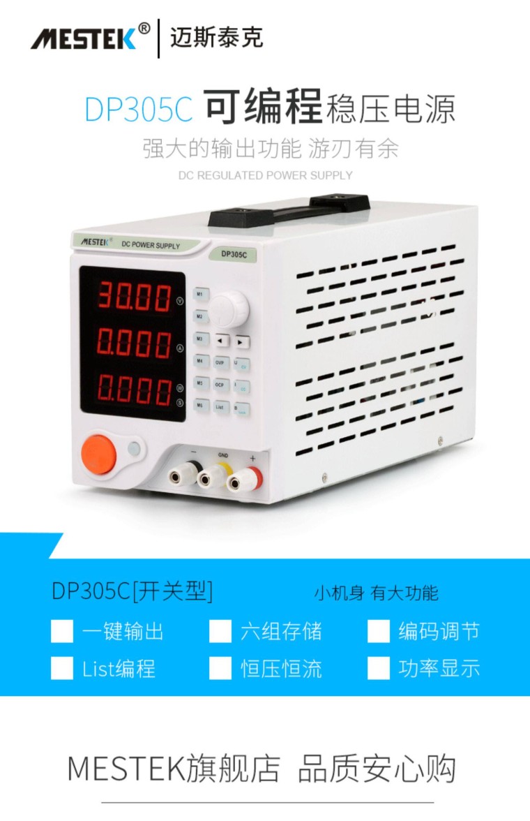 1、彩色四位数显示 2、输出电压/电流:0~30V/0~5A 3、可选电压:110V/220V 4、电压/电流分辨率:10mV/1mA 5、显示精度/分辨率:±1%±1% 6、电压/电流功率效应:<0.1%+5mV/<0.03%+3mA 7、电压/电流负载效应:<0.1%+5mV/≤0.01%+10mA 8、电压/电流波动:≤20mV RMS/≤100mA RMS 9、产品尺寸/重量:265(长)*125(宽)*145(高)mm / 约2.7kg 卖点: 1、高稳定输出 2、六组数据存储/输出 3、恒压/恒流开关 4、步数可调,编码开关 5、接口可选:R232/485/USB ![]() ![]() ![]() ![]() ![]() ![]() ![]() ![]() |