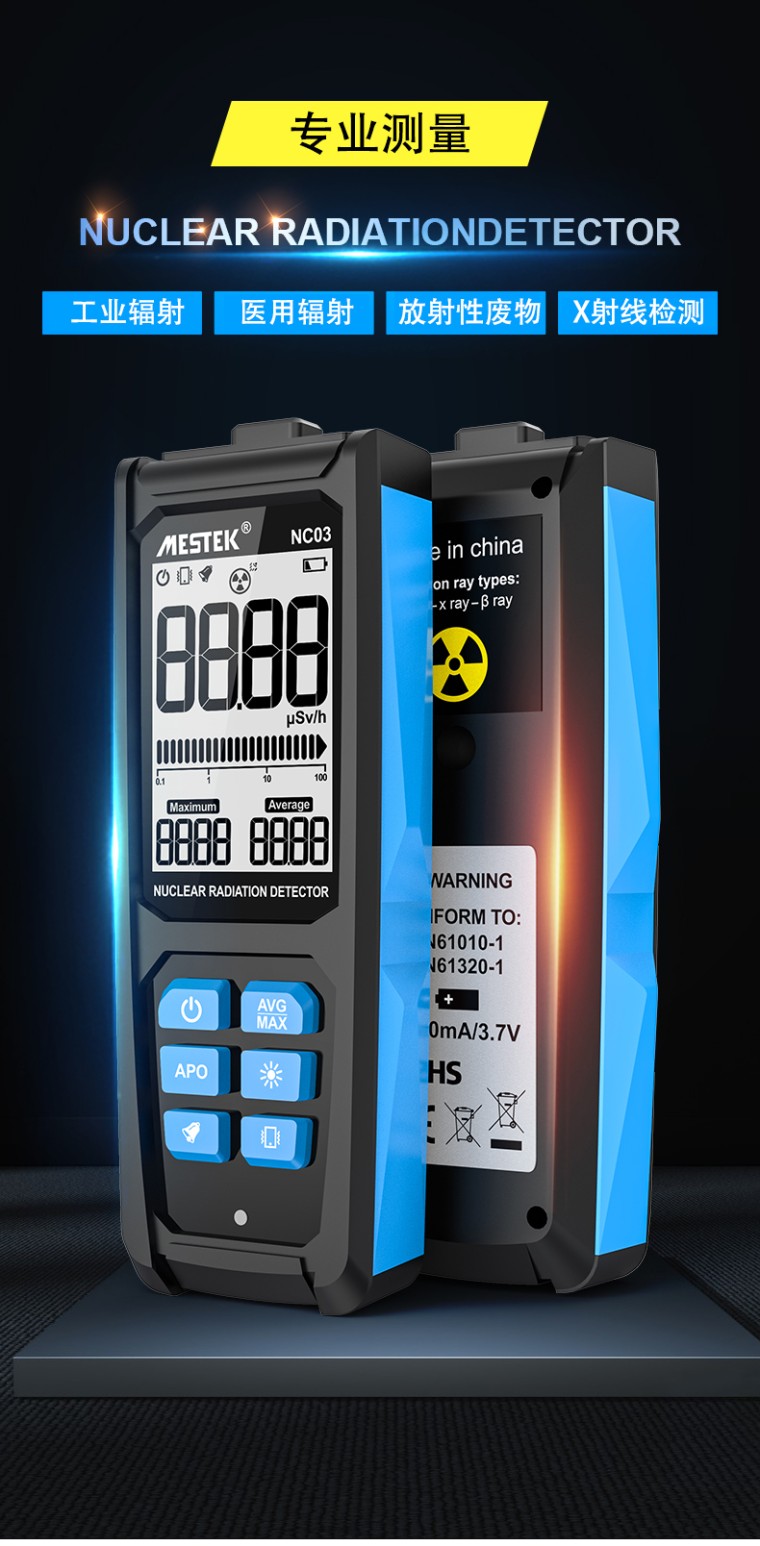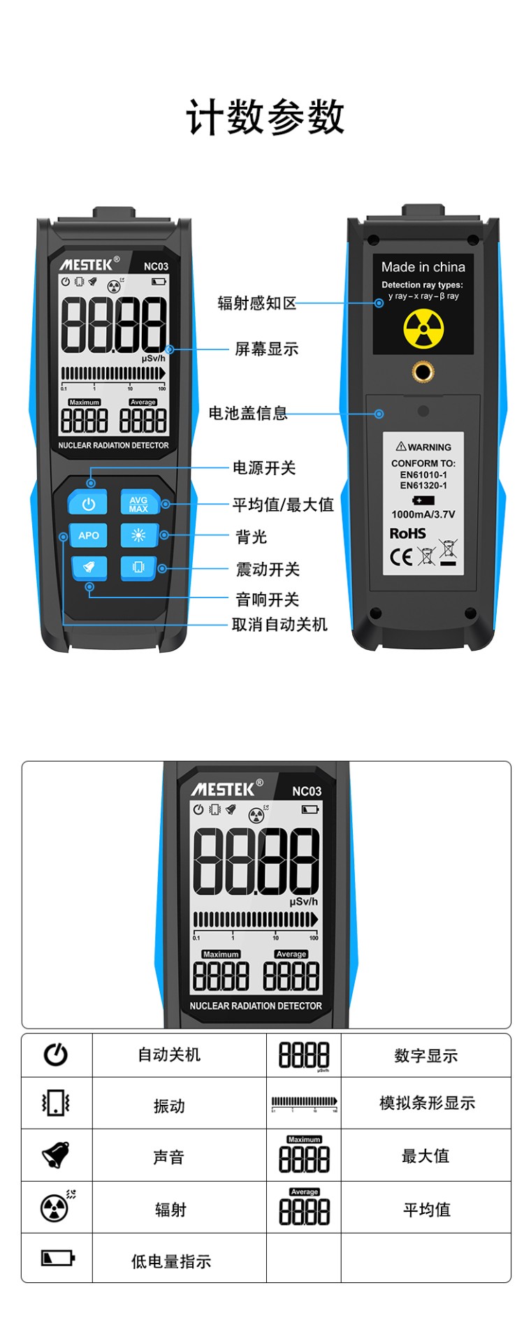 1、射线检测类型:B射线、y射线、X射线 2、剂量电流速率:0~10000uSv/h(10mSv/h)能量范围:48ke V-1.5meV<30%(基于137摄氏度) 3、灵敏度:80CPM/uSv(基于60Co) 4、屏幕:彩色波晶显示屏 5、检测传感器:盖革计数器 6、Backligt 自动关闭:约10分钟 7、报警类型:声音和振动 8、充电:5V/1A(USB Type-C) 9、工作环境:0~50℃/5~75%RH 10、储存环境:-10-60℃/5-75%RH ![]() ![]() |