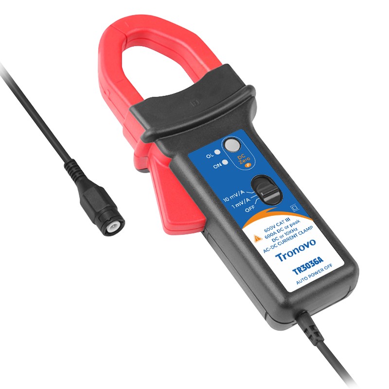 TR3036A交直流电流探头 TR3036A是一款通用型示波器电流探头,兼容市场上95%以上的示波器,高达10KHz的频率响应测量范围0.5A 到600A(峰值),BNC输出端子。连接示波器可精准测量AC或DC电流波形,手柄面板上的三位置滑动开关可 选择量程和ON/OFF。 产品特点: • 交直流两用 • 电流测量范围:0.5A 到600A • 可测量的线缆 (Ø30mm或Ø24mmx2) • 狭长钳口设计,方便使用于布线密集的窄小空间 • 9V 碱性电池,55小时连续工作 • 精准测量、分析并显示失真电流波形和谐波