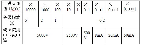 1.可调范围: 0~121111.110MΩ,最小步进100Ω。 2.各十进盘的等级指数和最高使用电压或电流(即参考电压或电流)见表1。 3.最高使用电压或电流改变至1/5最高使用电压或电流 时,由于电压或电流的变化引起电阻的变差应不大于对应的一个等级指数。 4.电阻器参考温度:23 ℃ 标称使用温度:23±5℃ 5. 本电阻器适用于周围空气温度23±5℃,相对湿度≤80%的环境中使用。 6.路对外壳的绝缘电阻:≥1×1012Ω。 7.线路对外壳的绝缘强度应能承受50Hz正弦波电压8000V,历时一分钟试验不击穿。 8.仪器外形尺寸:490mm×249mm×171mm。 9.仪器重量: <15kg。 |