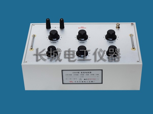 一、电阻器的结构和特点 ZX83型直流电阻器为六个串联的十进电阻开关组组成多 值电阻器。电阻元件均接于开关上各个触点之间,两接线柱之间的电阻值可以通过改变开关电刷位置而使其阻值改变。 ZX83型直流电阻器开关采用绝缘塑料制成,不需要清洗,接触压力小,变差小,寿命长。电阻元件均采用优质合金线以无感绕制,并经过严格的工艺处理,稳定性高。电阻器可在水平和垂直方向使用。 二、用途 1、适合于工厂、学校和科研单位作电测量和其它实验用; 2、供直流电路中作精密调节电阻用; 3、可供整机校验携带式直流电桥等。 三、电阻器主要技术指标 1、电阻器的阻值调节范围:O—ll.lllOMΩ 2、电阻器的参考温度和标称温度范围: 参考范围:20±l℃ 标称范围:20±10℃ 3、电阻器的参考相对湿度和标称范围: 参考范围:40%~60% 标称范围:25%~75% 4、在参考温度、相对湿度和功率的条件下,每只十进盘的准确度应符合下表规定。