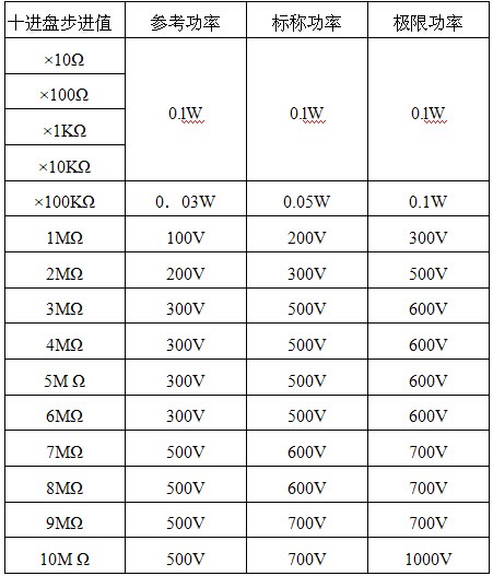 5、温度和功率在参考条件下,相对湿度超过参考范围但在标称范围之内,由于相对湿度引起的附加误差允许为相应一个等级指数。 6、相对湿度和功率在参考条件下,温度超过参考范围,但在标称范围之内,由于温度引起的附加误差允许为相应一个等级指数。 7、ZX83型电阻器的参考、标称和极限功率电压如下表规定。 8、温度、相对湿度在参考条件下,功率超过参考功率范围,但在标称功率范围内,由于功率引起的附加误差允许为相应一个等级指数,ZX84型电阻器,能经受2小时极限功率作用,当电阻器恢复到参考条件时,施加极限功率作用前后的电阻器实际变化不应超过相应一个等级指数的10%。 9、电阻器由于每只开关的变动而引起的电阻值变化不应超过2.5m Ω。 10、电阻器的残余电阻及公差R 0 =(13±10) mΩ。 11、电阻器在参考条件下,电路对外壳金属之间的绝缘电阻应≥1000MΩ 。 |