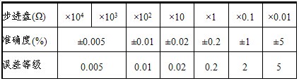 一、用途 本型直流电阻器为串连十进盘所组成的多值电阻器,两接线柱之间的电阻值可以通过改变开关电刷触头位置而使其改变,能方便地整机校验0.02级以下的电阻器及整机校验携带式直流单臂电桥等。还可用于工厂、学校和科研单位作电测和在直流电路中作精密调节电阻之用。本电阻器具有零电阻小、电阻变差小的优点。 二、主要技术指标 1、电阻值调节范围:0~111111.10Ω 2、各步进盘准确度: 3、电阻器的残余电阻R0=(10±2)mΩ; 4、电阻器的参考功率:0.05W;标称使用功率:0.1W。 5、参考温度:20±0.5℃;标称使用温度:20±5℃。 6、参考相对湿度:40%~60%; 标称相对湿度:25%~80%。 7、电阻器线路与外壳之间的绝缘电阻≥1×1010Ω。 8、电阻器线路与外壳之间,能经受频率为50HZ,电压为2000V的正弦波交流电压,历时1分钟不击穿。 8、外形尺寸:410×260×150mm。 9、重量:约5kg。