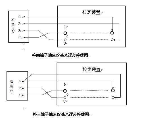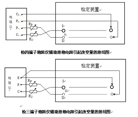 三、使用方法 由于不同型号的接地导通电阻测试仪(工频接地电阻测试仪)输出的测试电流不同,测试范围也可能不一样,因而检定装置的电阻值和最大工作电流也应与之匹配。在检定基本误差时,将被检测试仪置于适当的量程,用截面积足够大的连接线将本检定装置与被检测试仪正确连接,如下图所示: