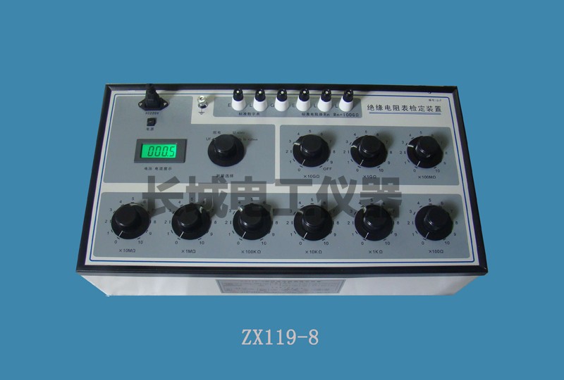 一、简介 本型绝缘电阻表检定装置是依据JJG1005—2005《电子式绝缘电阻表检定规程》、JJG622—1997《绝缘电阻表(兆欧表)检定规程》的有关检定项目要求,并参考电力行业标准DL/T845.1—2004《电子式绝缘电阻表》通用技术条件中的相关内容设计制造的专用设备,用于检定电子式绝缘电阻表的示值误差、跌落电压(Ud),短路电流。与本公司生产的恒速器(CY3型)配合可检定指针式兆欧表的示值误差、开路电压(Uk)、中值电压(Uz)、峰值电压(Uf)。具有结构紧凑、性能稳定、使用方便等特点。是各工矿、企事业单位用来检定各类绝缘电阻表的理想设备。 二、主要技术指标 本绝缘电阻表检定装置主要用来检定额定电压≤5000V的各类绝缘电阻表,也可在绝缘电阻表生产、修理中作标准器具。其电阻器部分可单独使用。数字表部分可测最高8000V的直流电压。 本检定装置的主要技术性能如下: ㈠ 标准数字表 1、测量范围: 电压为自动量程分两档:0~2000V 1000~5000V 短路电流:0~20mA 2、基本误差:
