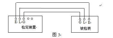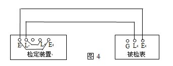 3、检定绝缘电阻表的中值(跌落)电压的接线图如图4。参照附录1、附录2确定被检表的中值电阻值,将本装置的标准电阻器调节到该阻值,“测量选择”开关置于适合位置即可测试。