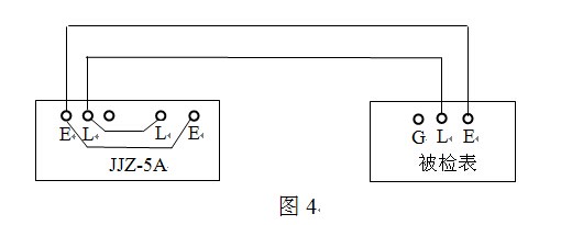 3、检定绝缘电阻表的中值(跌落)电压的接线图如图4。参照附录2、附录3确定被检表的中值电阻值,将本装置的标准电阻器调节到该阻值,“测量选择”开关置于适合位置即可测试。