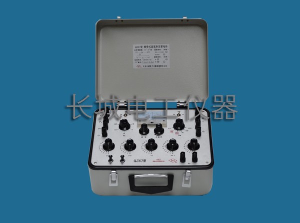 QJ47型直流单双臂电桥,按照中华人民共和国国家标准GB3930-83《测量电阻用直流电桥》所规定的有关技术要求制造。 一、用途 QJ47型直流单双臂电桥,测量范围广,准确度高,适合于工矿企业、科研计量单位、大专院校在实验室及现场作直流电阻精密测量之用。 二、主要技术指标 1、测量范围:10-3~106 Ω 2、准确度等级:0.01~100kΩ 0.05%,其它阻值0.2%。 3、保证准确度测量范围:10-3~105 Ω 4、仪器使用条件: a、温度参靠值:20±0.5 ℃ b、温度标称使用范围:20±0.5 ℃ c、湿度参考值:40%~60% d、湿度标称使用范围:25%~80% 5、电源: 1号干电池5节,9V叠层电池1节; 6、仪器附带检流计及标准电阻,无需配套其他仪器即可使用; 7、外形尺寸:320mm*260mm*160mm |